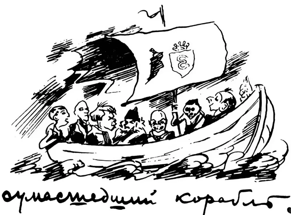 Теперь снова посмотрим на кажущийся невинным шарж. Корешки книг Форш как бы выстраиваются в надпись: «Современники — Символисты — Одеты камнем». И еще раз повторено зловещее — «Одеты камнем». Мандельштам — и современник, и символист в своем раннем творчестве, и именно в 1934 году он никак не мог присутствовать на съезде писателей, находясь в ссылке после первого заключения. В мае 1934 года Мандельштама арестовали за его антисоветские стихи, в частности за знаменитую «дразнилку»: «Мы живем, под собою не чуя страны…» Ко времени начала съезда Мандельштам после заключения и высылки в Чердынь был отправлен на поселение в Воронеж. Нельзя исключать, что публикация рискованного шаржа была намеренно санкционирована Кольцовым, охотно печатавшим Мандельштама в «Огоньке».