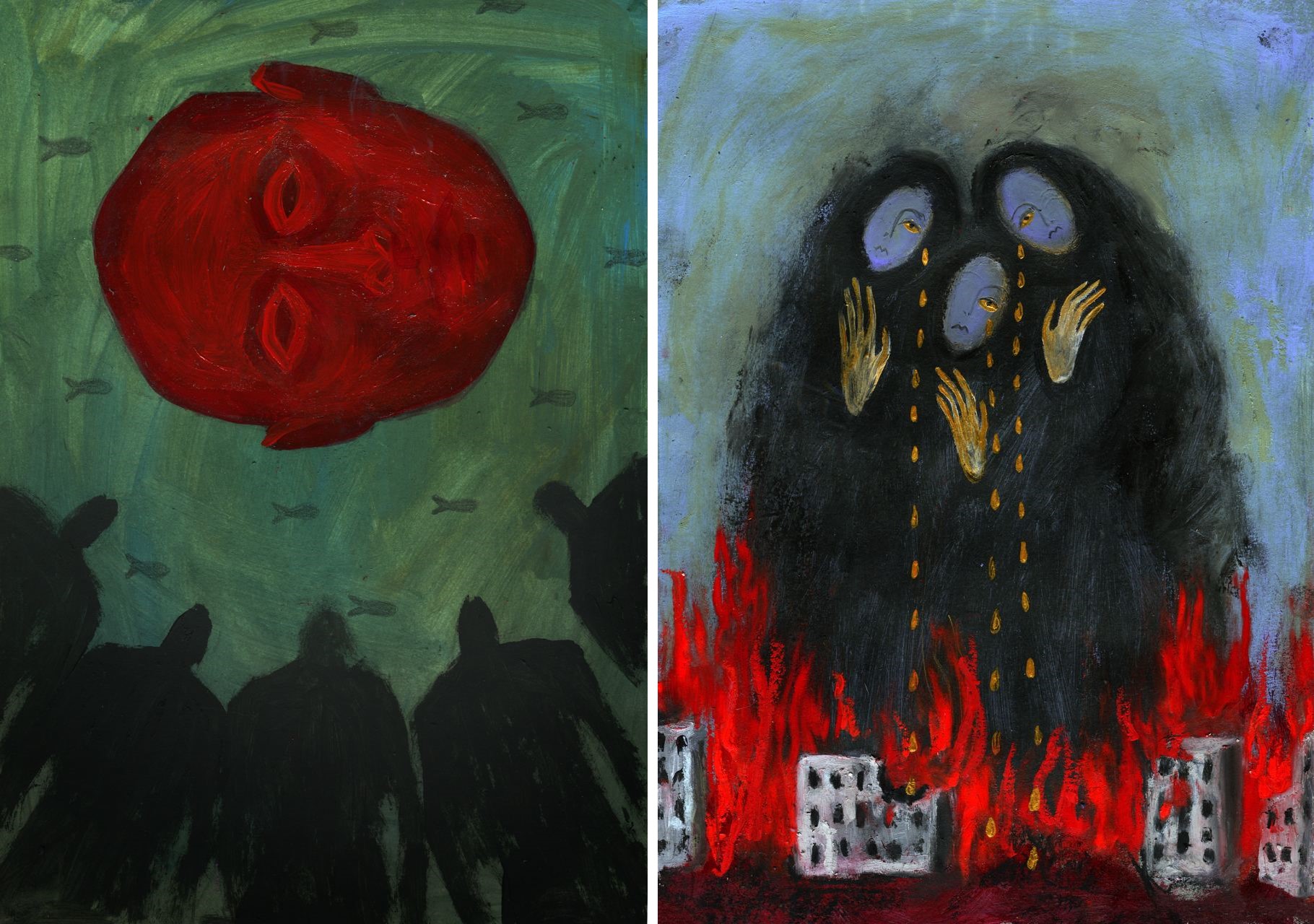 Мы переживаем общую беду, хотим помочь другим людям, но чувствуем свое бессилие. Все, что мы можем сейчас, — сострадать, не закрывать глаза. Так в картинах появился образ солидарности — большие, антропоморфные существа, которые оплакивают разрушенные дома. Когда я писала эту работу, думала о Мариуполе. Теперь все больше городов можно представить на этом же месте: Николаев, Буча, Краматорск, Харьков.