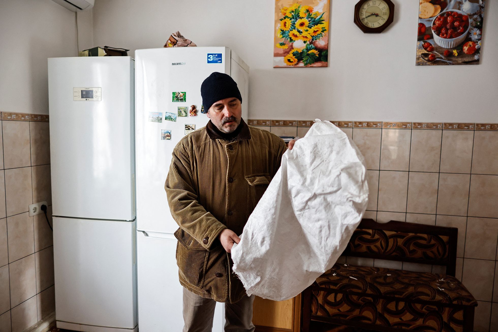 Zohra Bensemra / Reuters / Scanpix / LETA Виталий Животовский показывает один из белых мешков, которые, по его словам, российские военные надевали на голову пленным