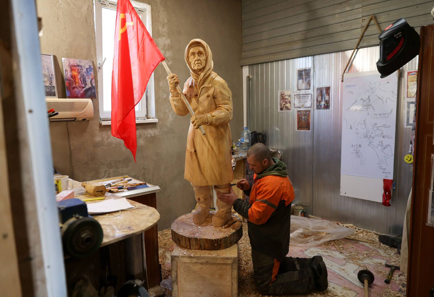 В начале апреля в СМИ появился ролик, в котором пенсионерка вышла встречать украинских солдат с красным советским знаменем, перепутав их с российскими военными. Вскоре сюжет подхватила российская пропаганда. За несколько недель пожилую женщину успели превратить в новый символ поддержки российской армии в Украине. Девятого мая деревянную скульптуру бабушки установят в центре Воронежа вместе с красным знаменем, побывавшим в Мариуполе. Автор скульптуры — 42-летний резчик по дереву из Воронежа Александр Ивченко. Он согласился поговорить с «Медузой» о статуе бабушки, которую он доделывает ко Дню Победы, категорическом императиве художника и священной войне «света (культурной России) с тьмой (западным обществом потребления)».