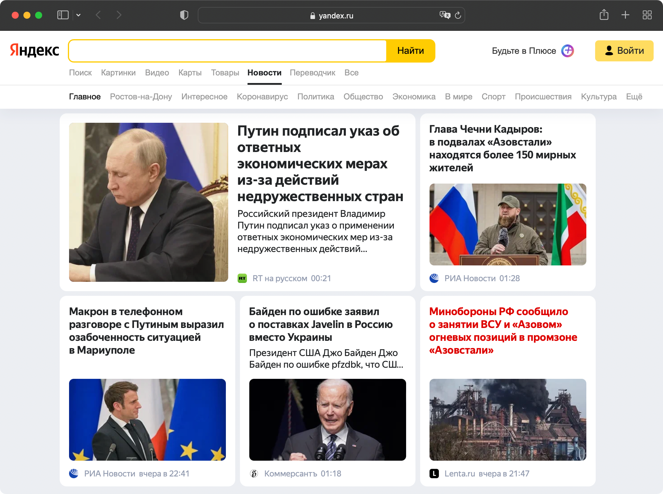 Сегодня шестой день войны России с Украиной, в который ракетами и залповыми системами огня обстреливаются жилые кварталы Харькова, общежития, роддома… Сегодня шестой день, когда на главной странице «Яндекса» минимум 30 млн российских пользователей видят, что никакой войны нет, тысяч погибших российских солдат нет, десятков погибших под российскими бомбежками мирных жителей нет, нет десятков пленных, нет огромных разрушений в разных украинских городах. То, что значительная часть населения России может считать, что войны нет, является основой и движущей силой этой войны. «Яндекс» сегодня — ключевой элемент в сокрытии информации о войне. Каждый день и час таких «новостей» — это человеческие жизни.