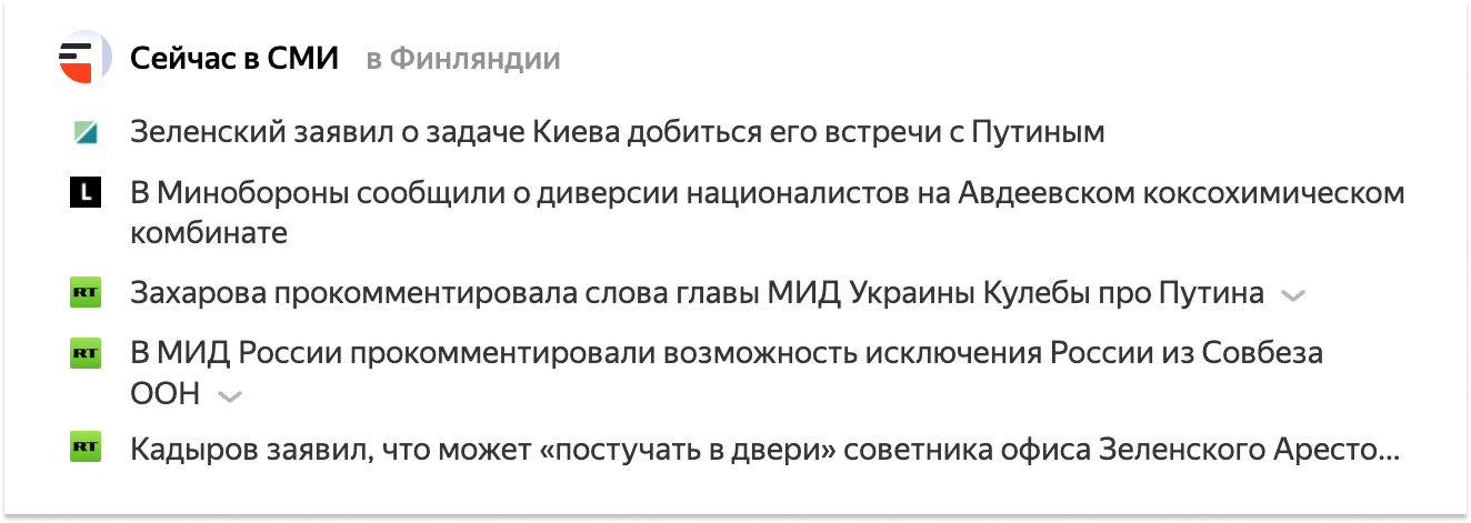 «Тогда еще работали нормальные российские СМИ — те же „Эхо Москвы“, „Дождь“, „Новая газета“. Они были зарегистрированы в России, нормально цитировались [другими медиа], но „Яндекс“ их на первую страницу в заголовки не выводил, а выводил, например, „Известия“, РИА Новости, ТАСС, „Интерфакс“, „Российскую газету“, „Коммерсант“, „Ведомости“, РБК, „Газету.ру“, RT и „Ленту“», — перечисляет собеседник «Медузы» (еще один бывший сотрудник компании отмечает, что в список также входили издания Regnum, «Независимая газета» и «Взгляд»).