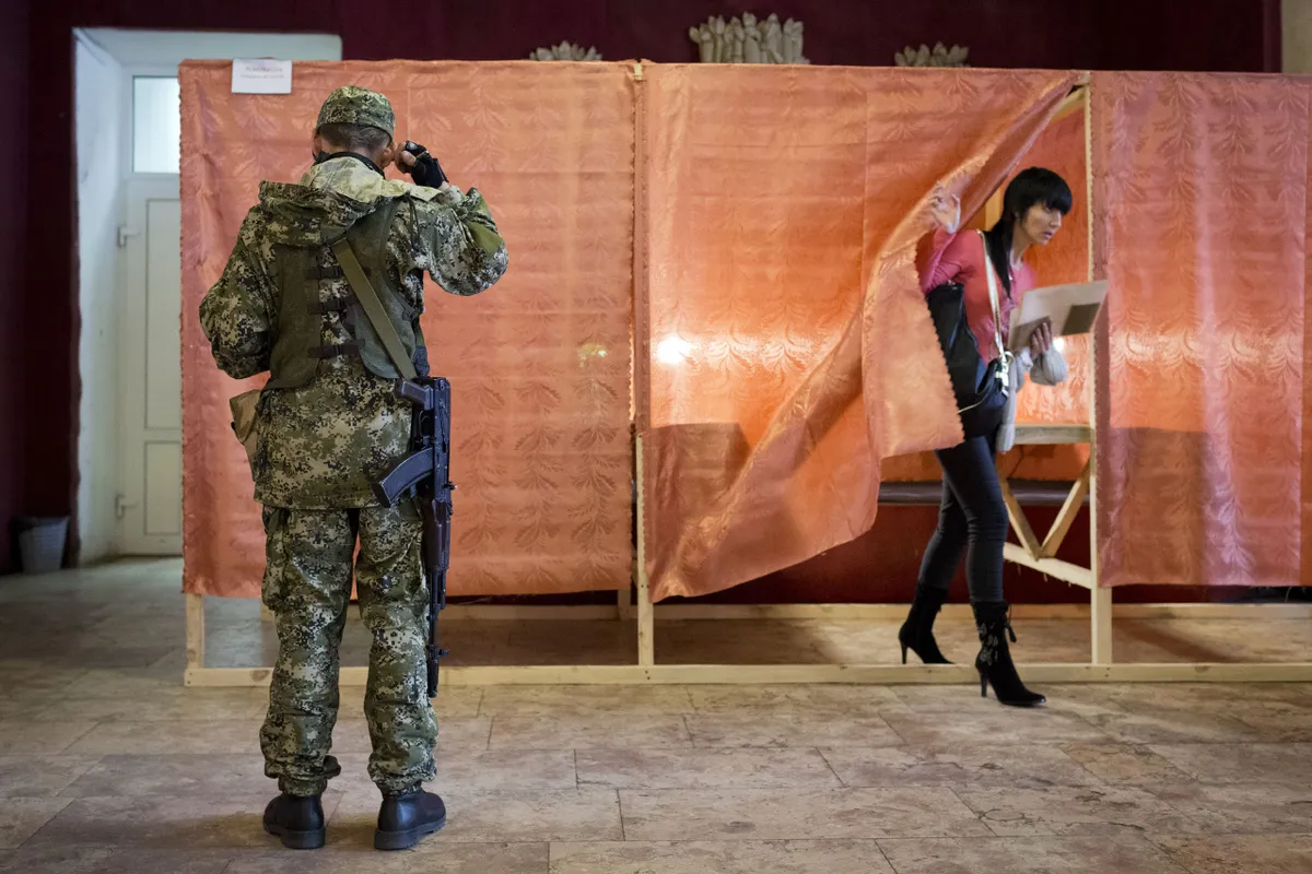 Ополченец голосует на избирательном участке в Славянске, 11 мая 2014 год