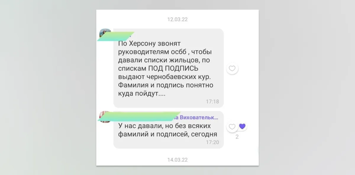 Первые сведения о принудительной переписи херсонцев стали появляться еще в середине марта. Так, в групповом чате детского сада Херсона, в котором есть и собеседница «Важных историй», воспитательница написала, что в городе обзванивают руководителей Объединения совладельцев многоквартирных домов (ОСМД), чтобы те дали списки жильцов. Взамен предлагают чернобаевских кур. Собеседница отметила, что куры — скорее предлог выманить информацию. «В Херсоне более 200 тысяч людей. Это ж где столько [кур] взять?» — удивляется она. В этом доме не выдали списки военным. Но те требуют списки и с предприятий, и с госучреждений, а также требуют прохожих оставлять данные на блокпостах.