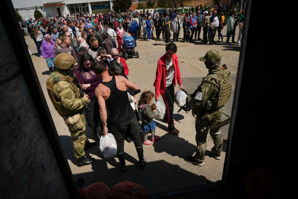 Местные жители получают гуманитарную помощь от МЧС ДНР в Бердянске, на территории, контролируемой ДНР, 30 апреля 2022 год.