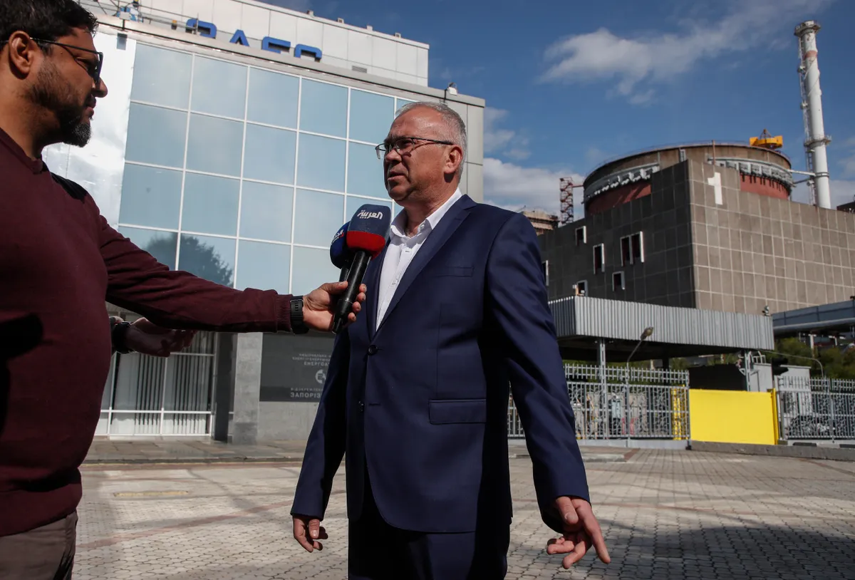 Глава администрации города Энергодар Андрей Шевчук дает интервью возле Запорожской АЭС в Энергодаре, Украина, 01 мая 2022 года.