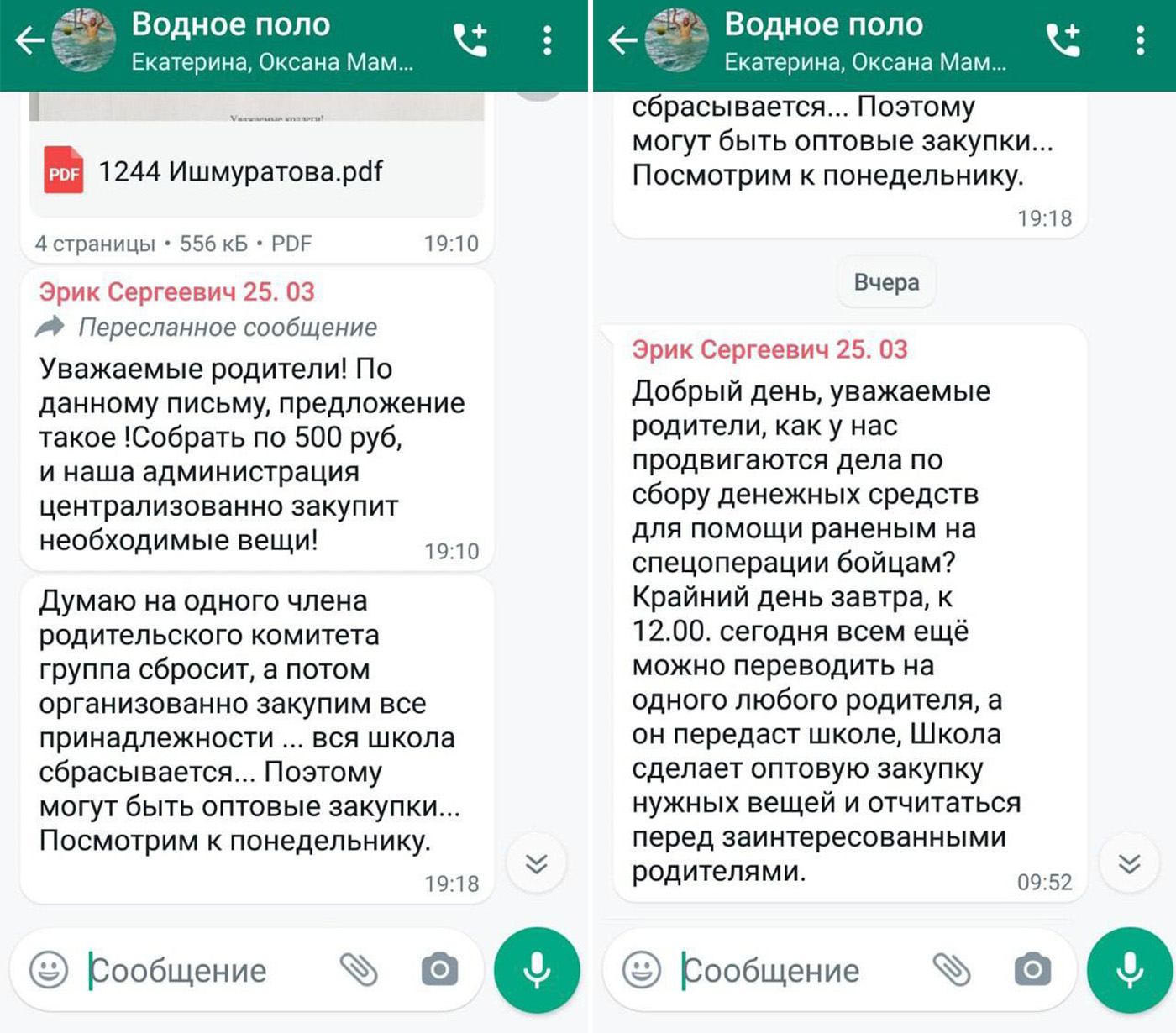 Получив письмо, тренер детской команды по водному поло школы ЦСКА в Москве Эрик Тукумов переслал его в родительский чат в Whatsapp вместе с предложением поучаствовать в сборе гуманитарной помощи — перечислить 500 рублей кому-то из членов родительского комитета, чтобы администрация смогла сделать централизованную закупку.