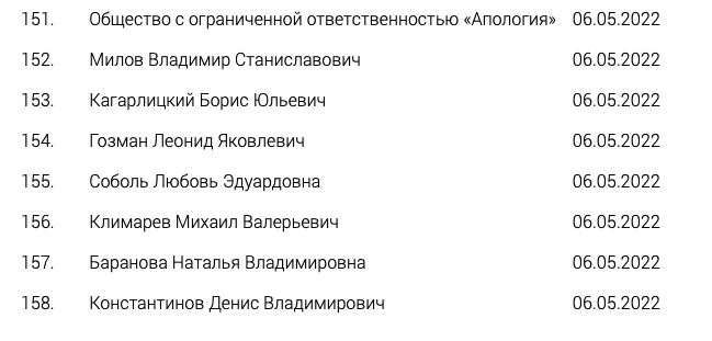 В реестр СМИ-«иноагентов» также попали публицист Борис Кагарлицкий, директор «Общества защиты интернета» Михаил Климарев, журналист Наталья Баранова, главред «Орловских новостей» Денис Константинов, а также Общество с ограниченной ответственностью «Апология», которая оказывает юридическую помощь по делам о нарушении прав и свобод человека.