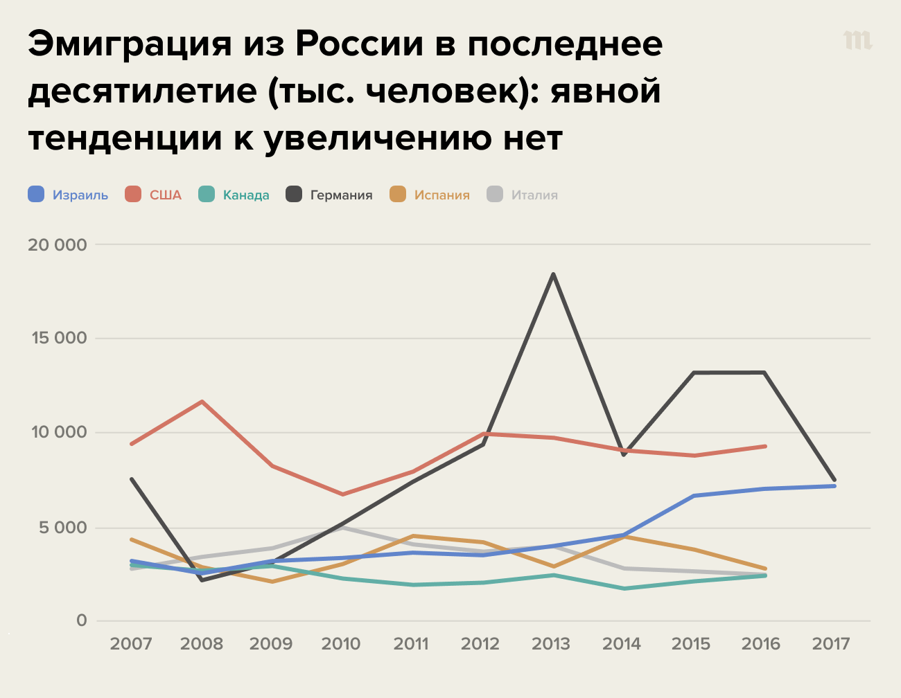 Однако большинство уезжает, никак не заявляя о своем отъезде, поэтому принято считать по данным принимающих стран. Они в несколько раз отличаются от данных Росстата. Разница зависит от страны, в некоторые годы [данные принимающей страны] были в три, пять и даже 20 раз больше, чем данные Росстата [по выезду в эту страну]. В среднем можно умножать на пять-шесть цифры [Росстата о 15–17 тысячах эмигрантов в год].