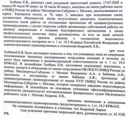 Сотруднице полиции вменяют превышение должностных полномочий (ч. 1 ст. 285 УК) и фальсификацию доказательств в административном деле (ч. 1 ст. 303 УК). Уголовное дело возбудили по следам задержания шестерых противников строительства Юго-восточной хорды в Москве и составления на них административных протоколов.