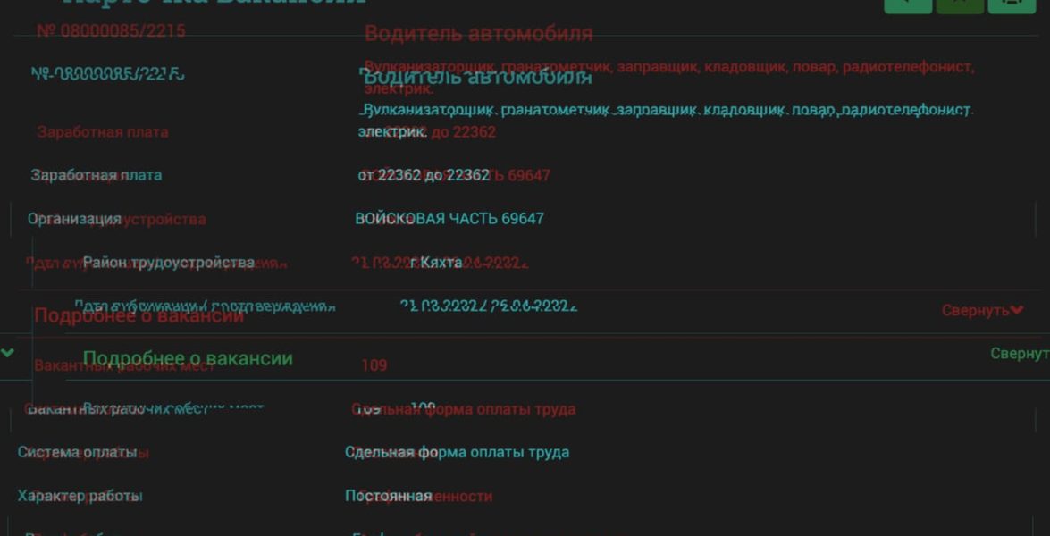 1239 человек набирает войсковая часть № 69647 в городе Кяхта республики Бурятия. Требуется 941 военнослужащий, это рядовые и сержанты, и 298 водителей. На главной странице заявлены четыре группы вакансий «водитель автомобиля». Если перейти в карточкам вакансий, то становится понятно, что набирают вовсе не водителей. Через сайт службы занятости военные ищут гранатомётчиков, радиотелефонистов, заряжающих, регулировщиков, химиков и даже разведчиков.