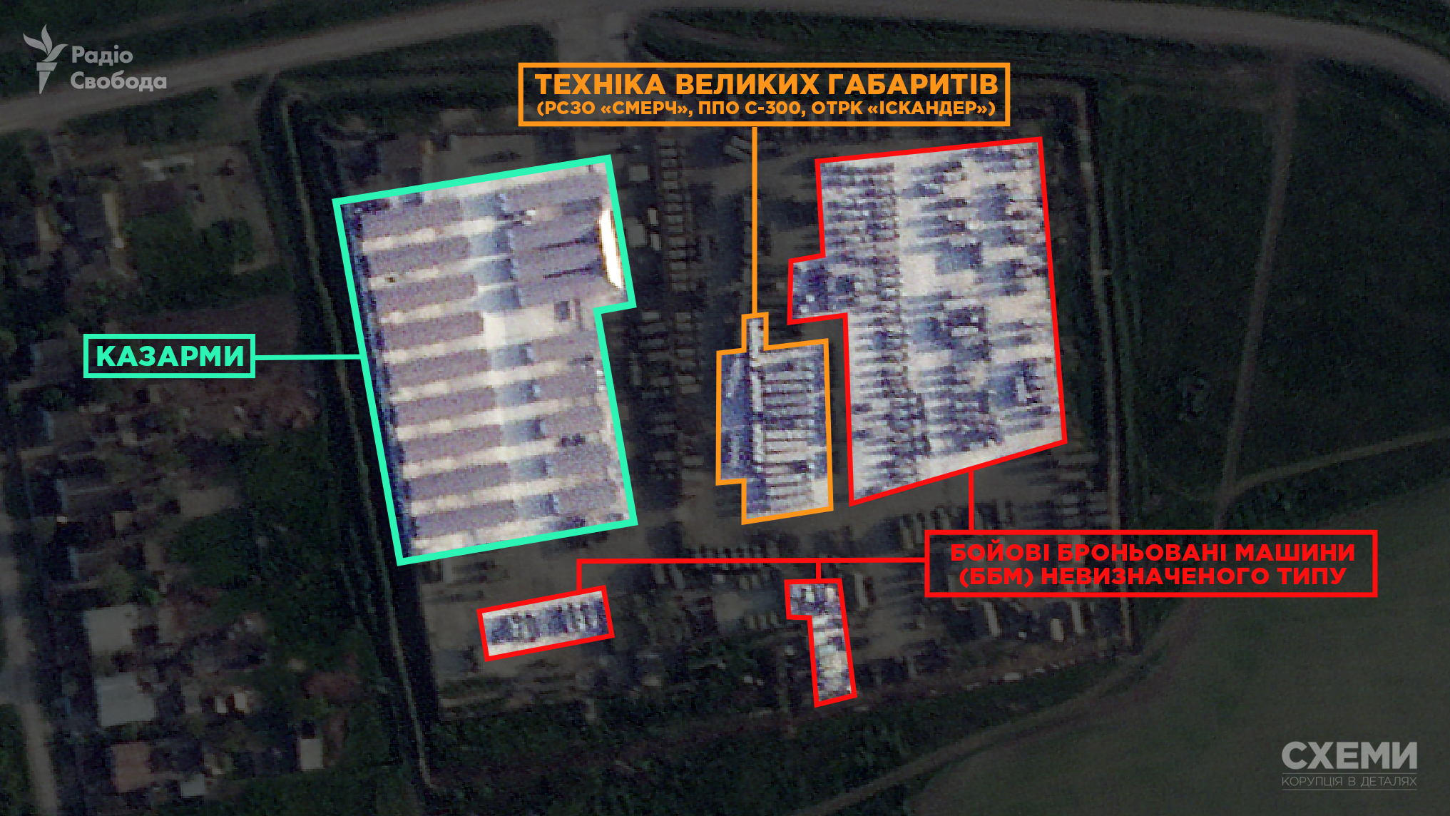 По словам военного эксперта, который по просьбе журналистов проанализировал снимок, кроме казарм, на этой территории расположен состав горюче-смазочных материалов. Также можно заметить около двухсот боевых бронированных машин разного типа и грузовых и командных автомобилей. Отдельно появилась крупногабаритная техника, которая, по словам эксперта, может быть зенитными и ракетными передвижными комплексами.