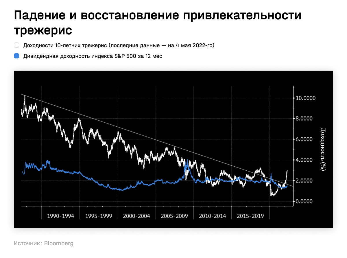Тем не менее на рынках происходят колоссальные изменения, говорящие о том, что некоторые долгосрочные тренды уже пересматриваются, пишет Джон Отерс, редактор Bloomberg. С того момента, как Волкер поборол инфляцию в США, доходности 10-летних трежерис снижались. Со времен мирового финансового кризиса доходности по ним были ниже дивидендной доходности акций из индекса S&P 500, что способствовало привлекательности акций. Сейчас это может измениться.