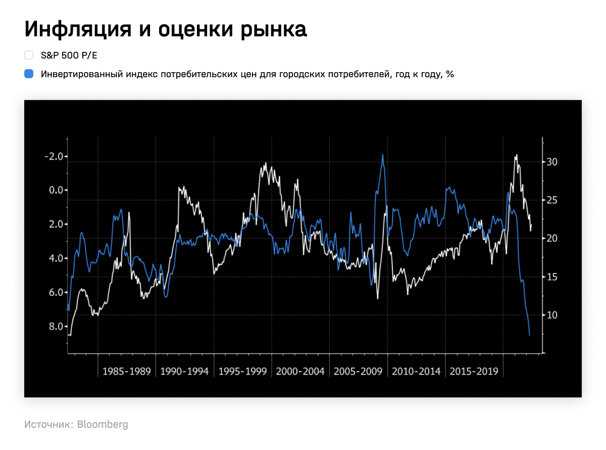 Как показывали расчеты GMO, инфляция является лучшим индикаторам для расчета будущей доходности акций: чем выше инфляция, тем ниже мультипликаторы, по которым инвесторы готовы покупать акции. Исторические данные показывают, что если с инфляцией не удастся совладать, то рынки могут упасть еще сильнее, показывает Отерс.