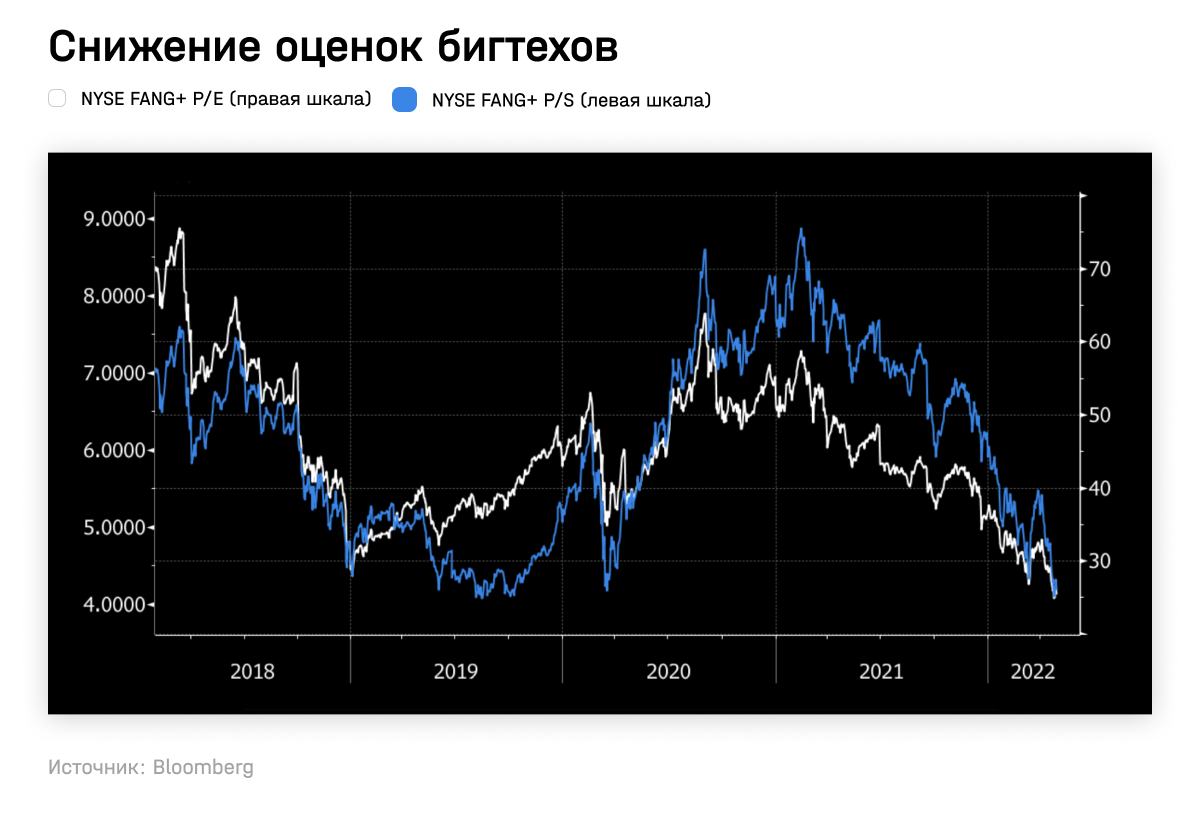 Завышенные за время пандемии оценки акций — начинают схлопываться: Price to Earnings (P/E) и Price to Sales (P/S) компаний из индекса NYSE FANG+ вернулись к доковидным уровням. Этот индекс включает пять самых крупных компаний на Нью-Йоркской бирже — Meta, Apple, Amazon, Netflix и Alphabet, а также пять активно торгующихся на бирже технологических компаний, включая Alibaba, Baidu, NVIDIA, Tesla и Twitter.
