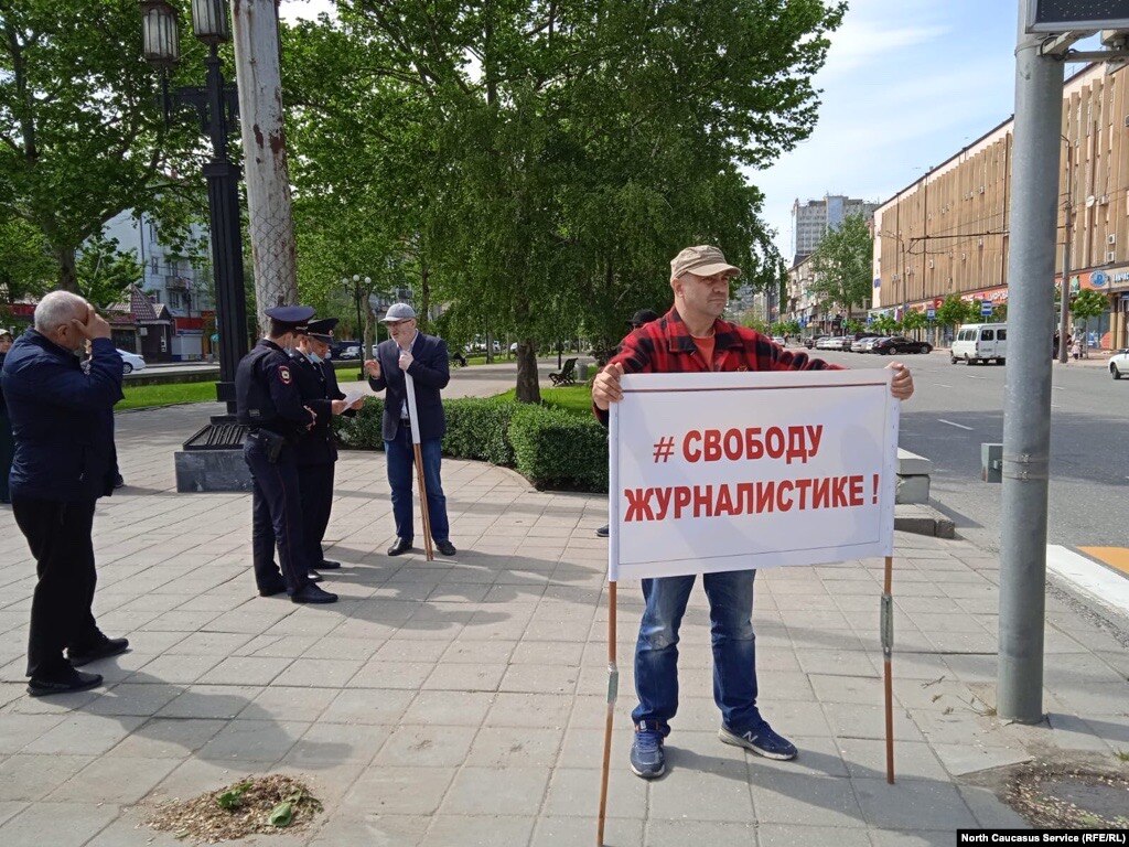 В Махачкале от участника пикета против уголовного преследования журналиста Абдулмумина Гаджиева потребовали пройти в отдел полиции. Полицейские обратились к учредителю газеты "Черновик" Магди Камалову, который вышел на акцию с плакатом "Свободу журналистике".