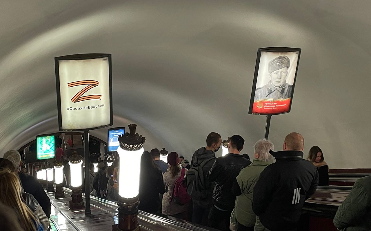 Другой символ «спецоперации», буква Z, чаще встречался в метро. На «Площади Восстания» плакат с ней повесили по соседству с портретами ветеранов Великой Отечественной войны. А в здании Витебского вокзала Z и V поместили прямо на плакат, посвященный 9 Мая: рядом с привычным поздравлением «С праздником Великой Победы!» появилось послание «Мы Vместе Za Родину!»