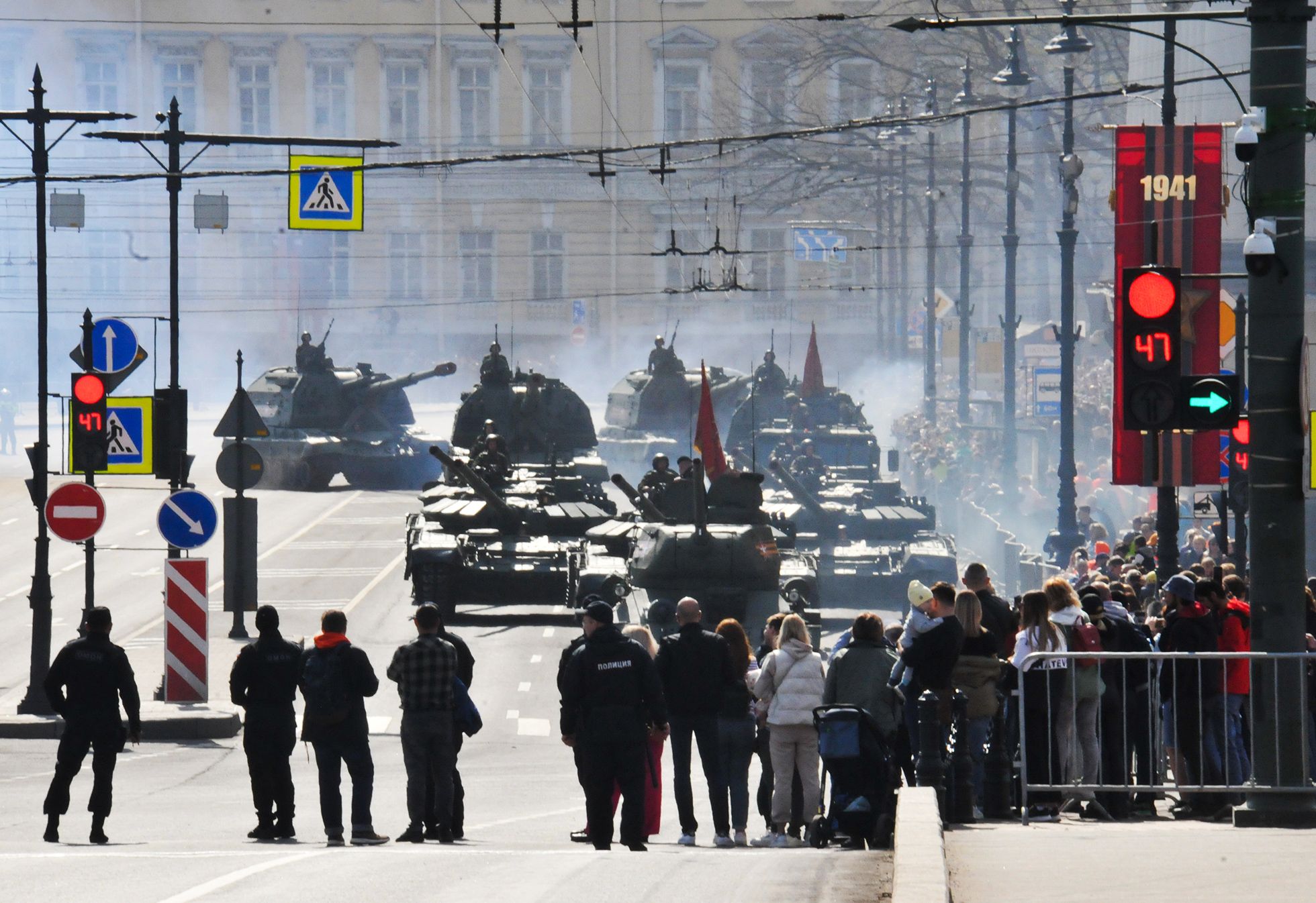 Парад продлился около часа. Как и в предыдущие годы, по Дворцовой площади прошли военные, курсанты и Юнармия, а после — колонна военной техники. Воздушную часть парада Победы в последний момент отменили из-за погодных условий.