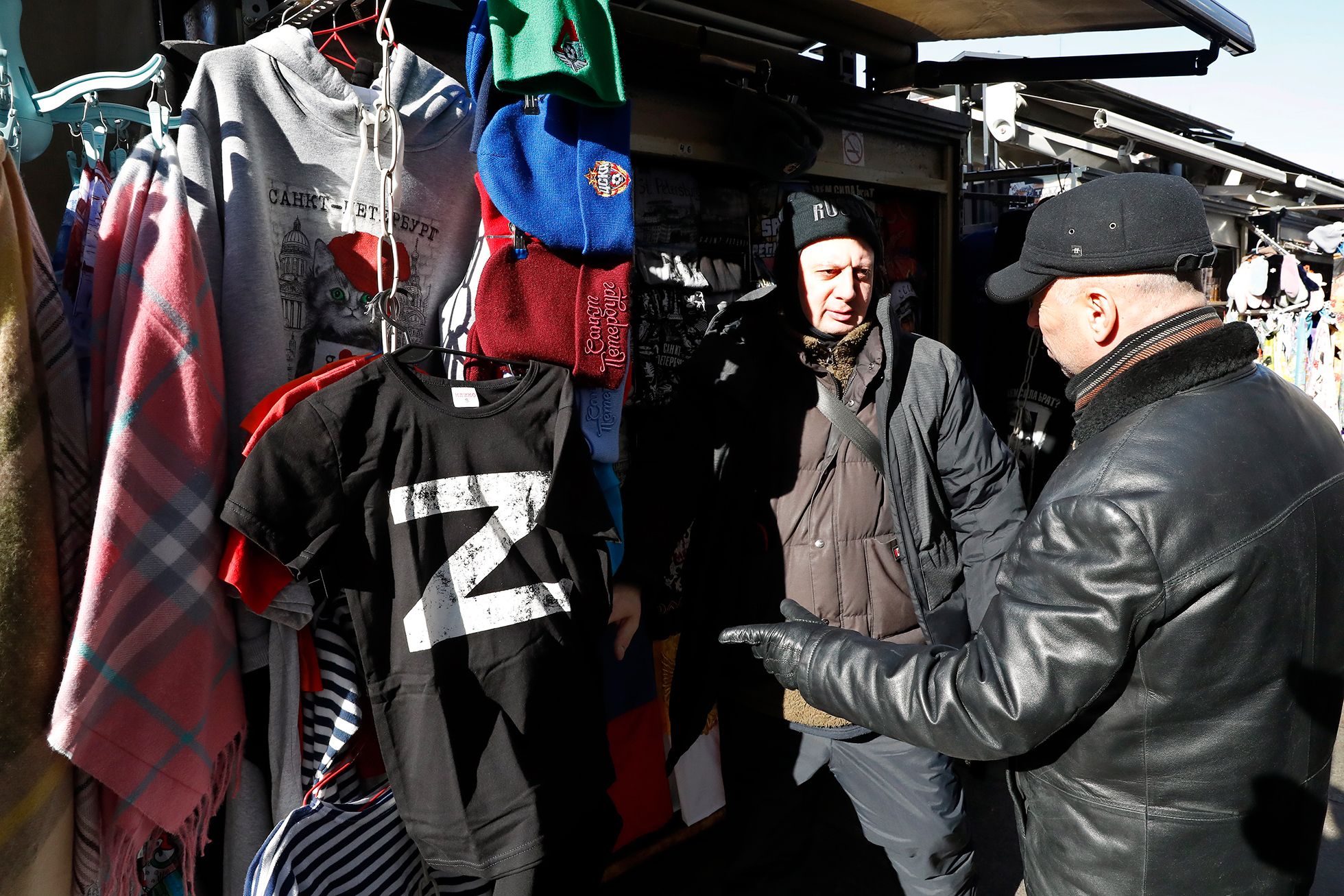 Футболки с той же Z начали продаваться в сувенирных киосках в самом центре города — в переходе у Гостиного Двора, Эрмитажа и храма Спаса на Крови. Стоят майки от 600 рублей до тысячи. «Я не хочу наживаться на чужом горе, поэтому продаю эти футболки дешевле остальных, — почти шепотом говорила продавщица в сувенирной лавке у Спаса на Крови. — Какой товар привозят, от нас не зависит. Мы просто продавцы».