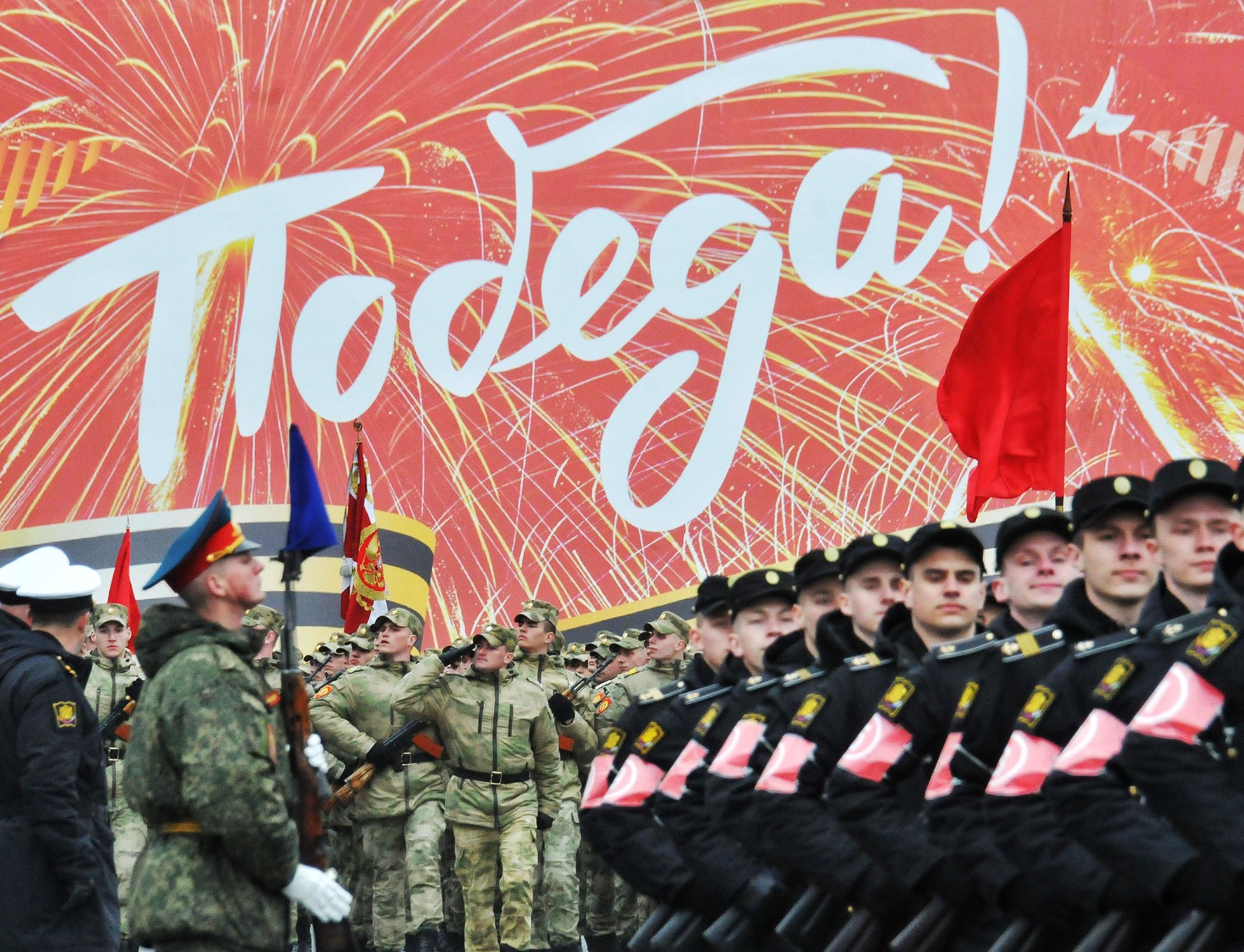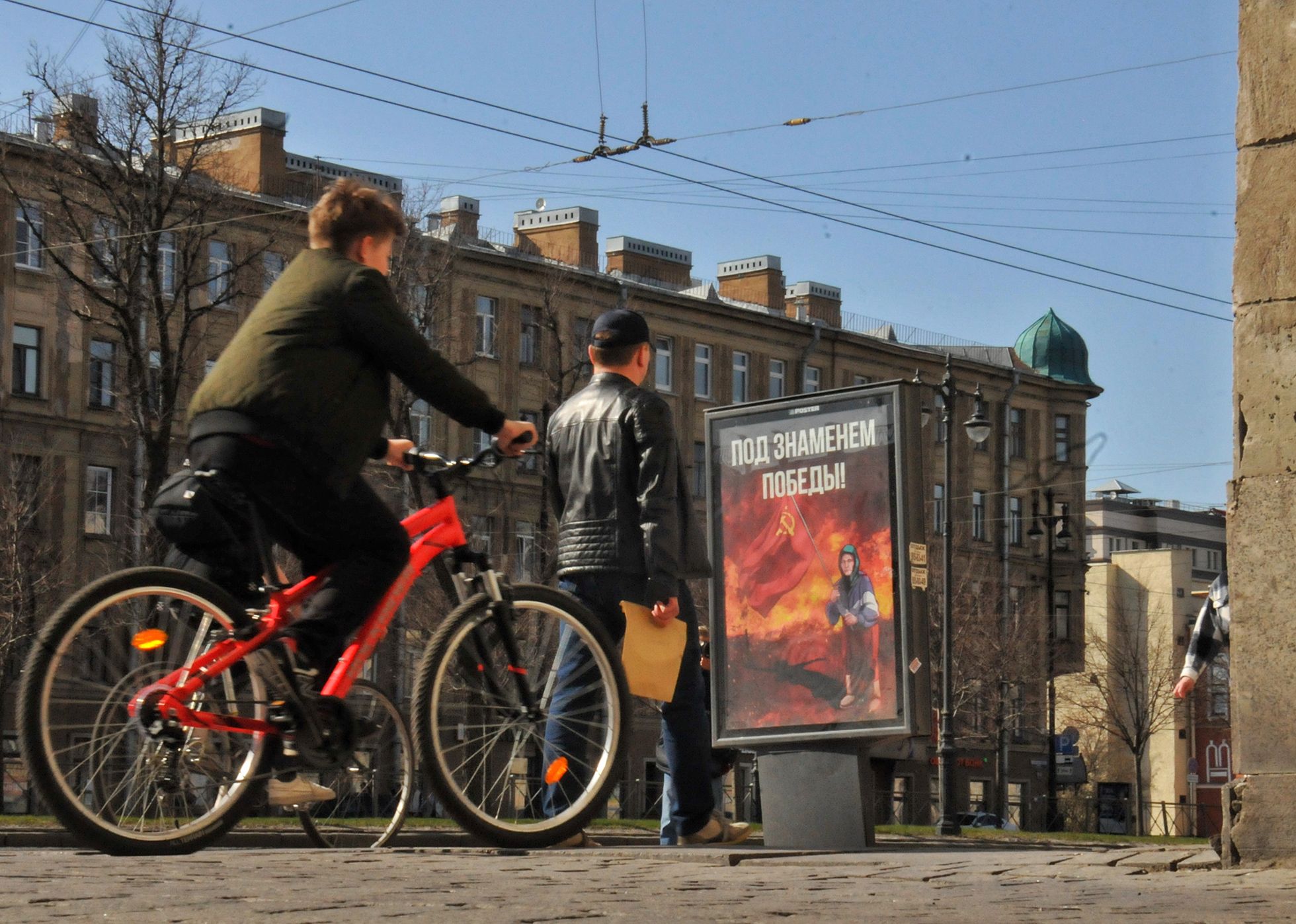 За несколько недель до Дня Победы на улицах Петербурга появились красные советские знамена, растяжки с георгиевскими лентами и орденами «Победа». У обелиска на площади Восстания установили инсталляцию: три красные звезды с датами начала и окончания войны, вокруг обелиска — гербы городов-героев Советского Союза (в том числе Киева). По всему центру развесили плакаты с «бабушкой с советским флагом».