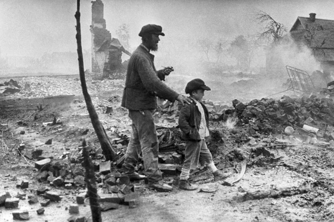 Потом, в октябре, в деревне были и те и другие. Начались бои — пули били, как горох. Наши в немцев из винтовок, немцы в наших. Солдаты гибли, а мы, дети, смеялись: «Дядьки падают».