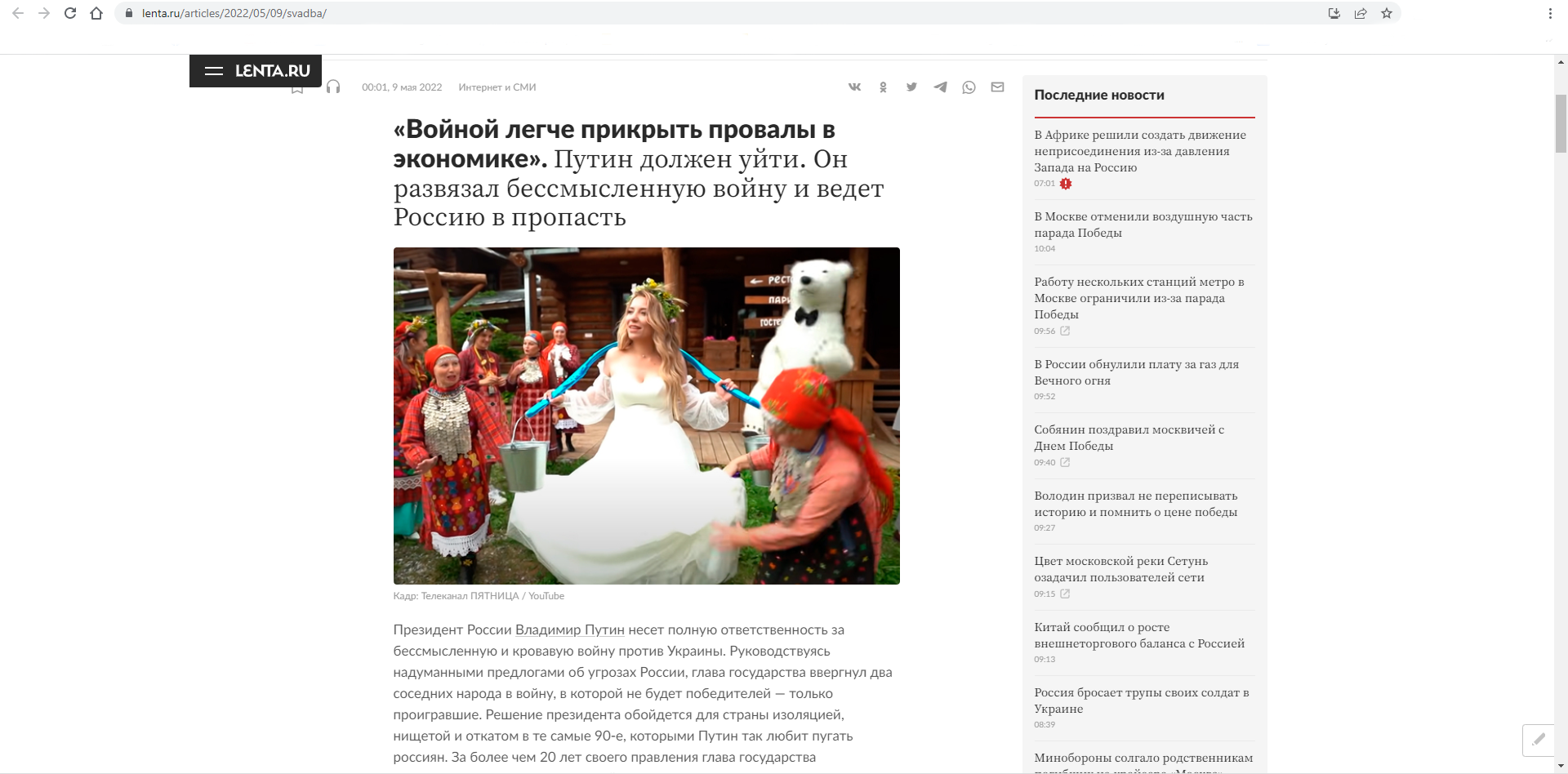 Утром 9 мая на сайте провластного российского издания «Лента.ру» появилось несколько сообщений, направленных против руководства России из-за войны в Украине. Внимание на это обратил журналист Илья Шепелин, опубликовавший несколько скриншотов.