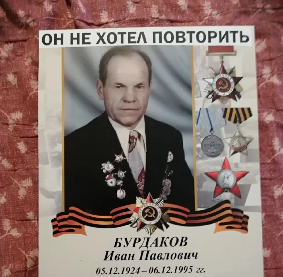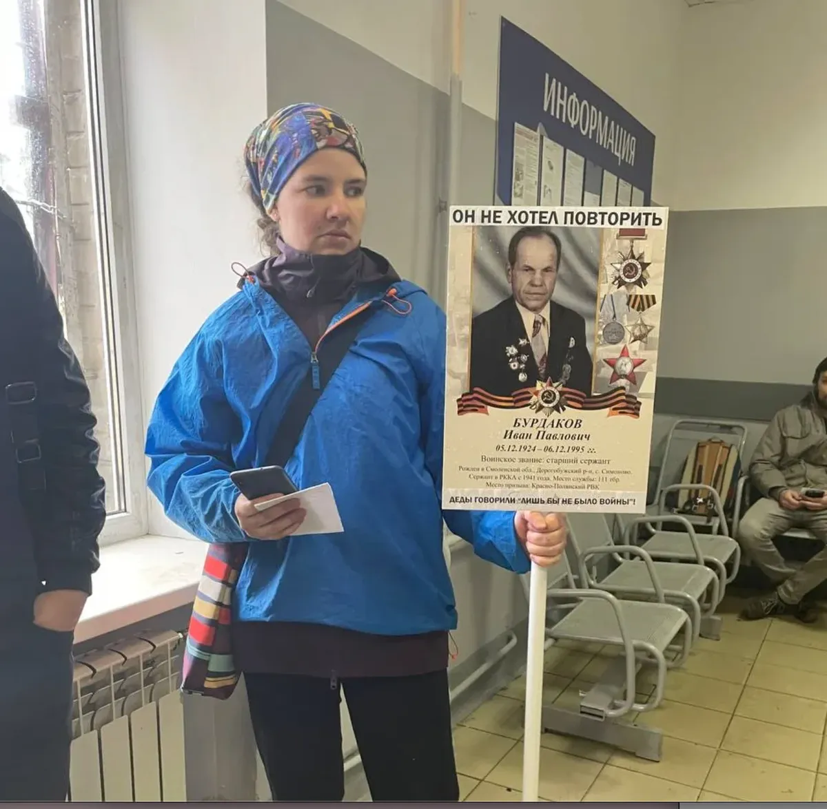 Voronina’s sign reads: “He wouldn’t have wanted to do it again,” “Our grandfathers said: As long as there’s no war!”, “Peace to the world!”, “He didn’t want war!” and “He fought for peace!”.