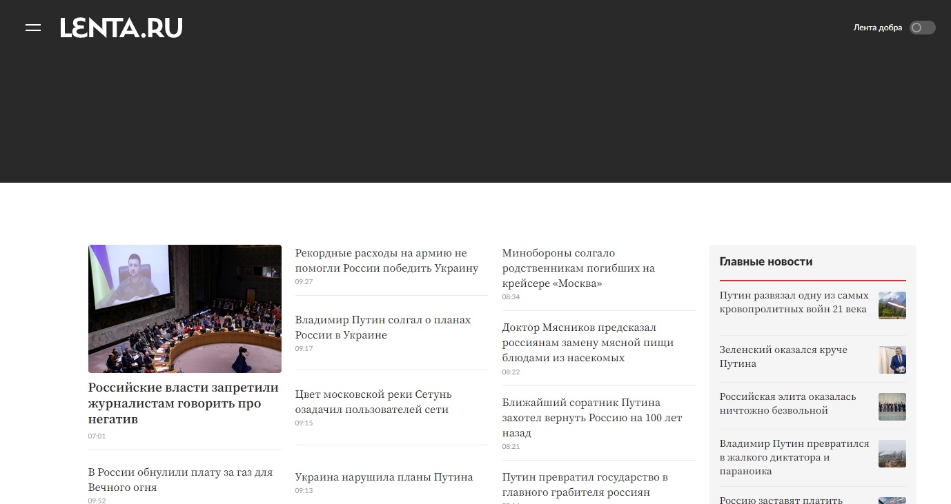На сайте "Лента.ру" – одном из самых посещаемых новостных сайтов в России – утром 9 мая были размещены несколько материалов с резкой критикой войны в Украине и российских властей.