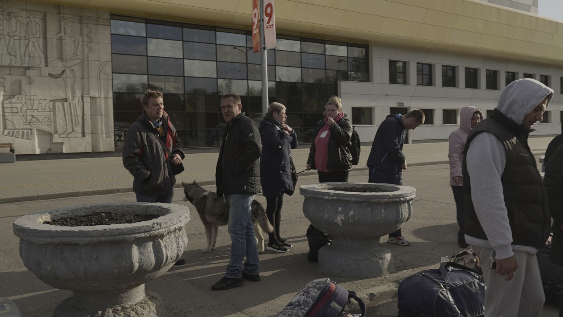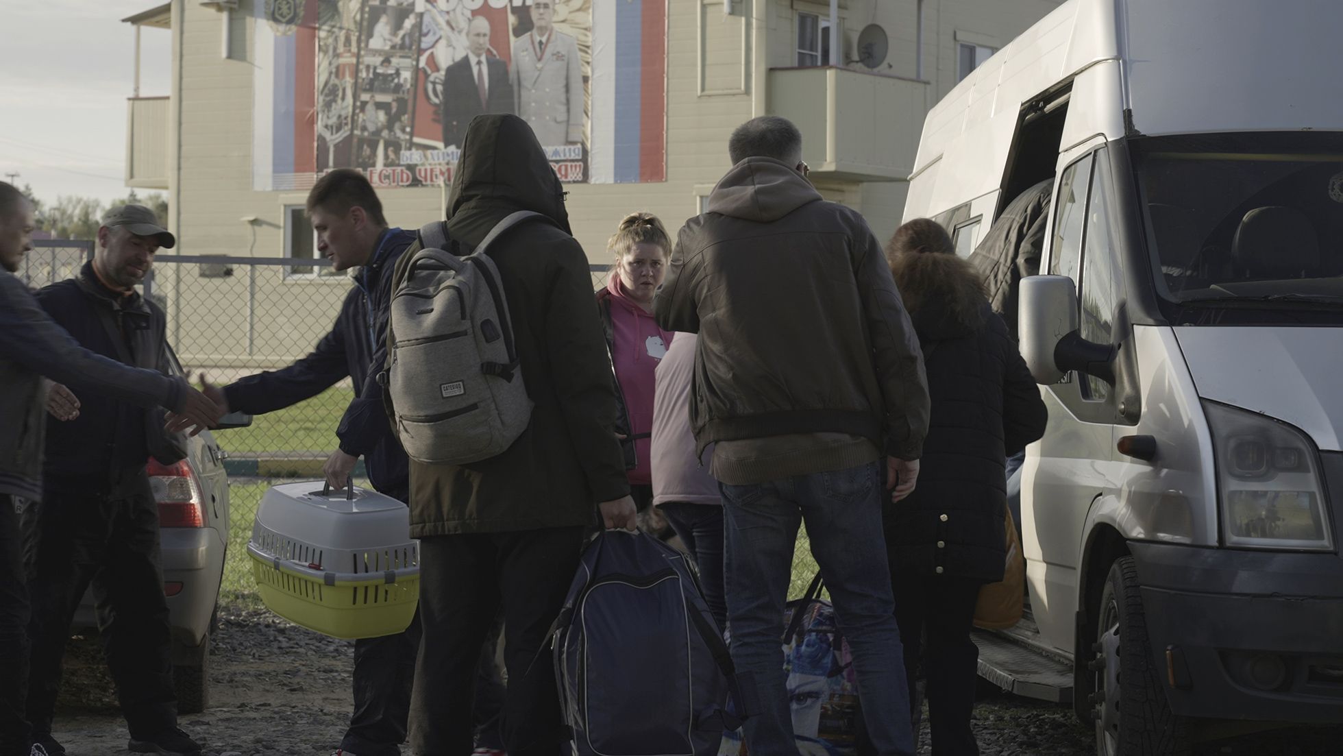 Через КПП из лагеря выходят 13 мариупольцев и провожающие. Светловолосая женщина ведет за руку ребенка, молчаливый мужик тащит переноску с маленьким злобным тойтерьером. У всех тяжелые баулы с вещами. Пока укладывают багаж, беженцы прощаются друг с другом и нервно курят. К Игорю подходит седеющая беженка в серой куртке: «Это вы ему билеты брали?»