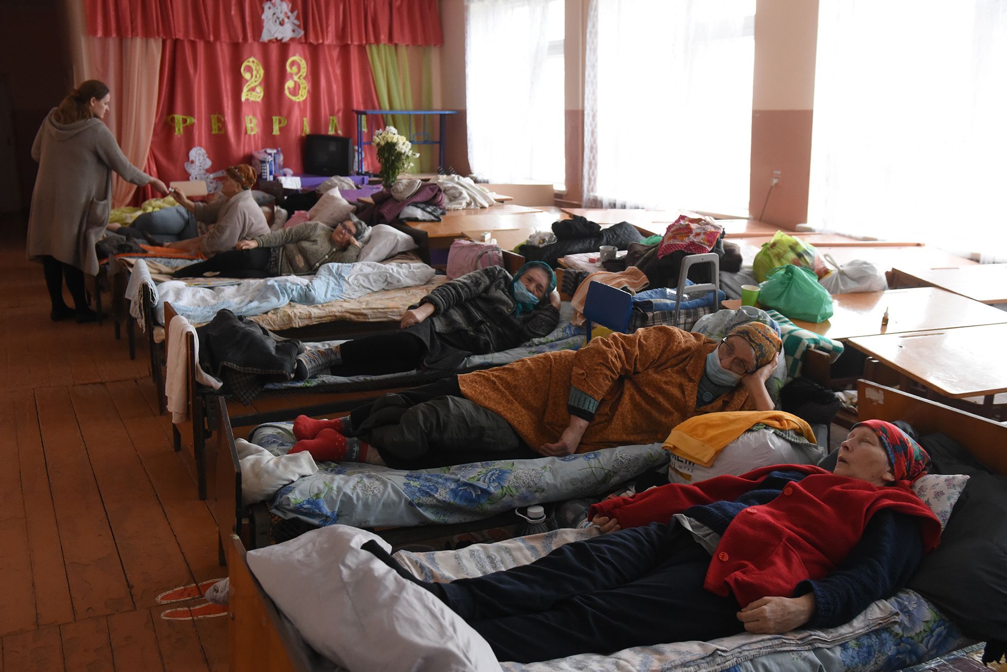 Сейчас по длинным коридорам этих зданий ходят беженцы из Украины. Они спят в отсеках из пары двухместных комнат с общим санузлом, толкают красные подносы по металлическим направляющим в огромной столовой и смотрят телевизор в гостиной с широкими старыми креслами. Узнав о прибытии волонтеров, беженцы вереницей выходят наружу. Кто-то получает заказанные вещи — детские мячи, мобильники, одежду. Другие просят помочь — не только в эвакуации. Тощий остроскулый парень в серой толстовке хочет увидеть мать в одной из пензенских больниц, куда его не пускают.
