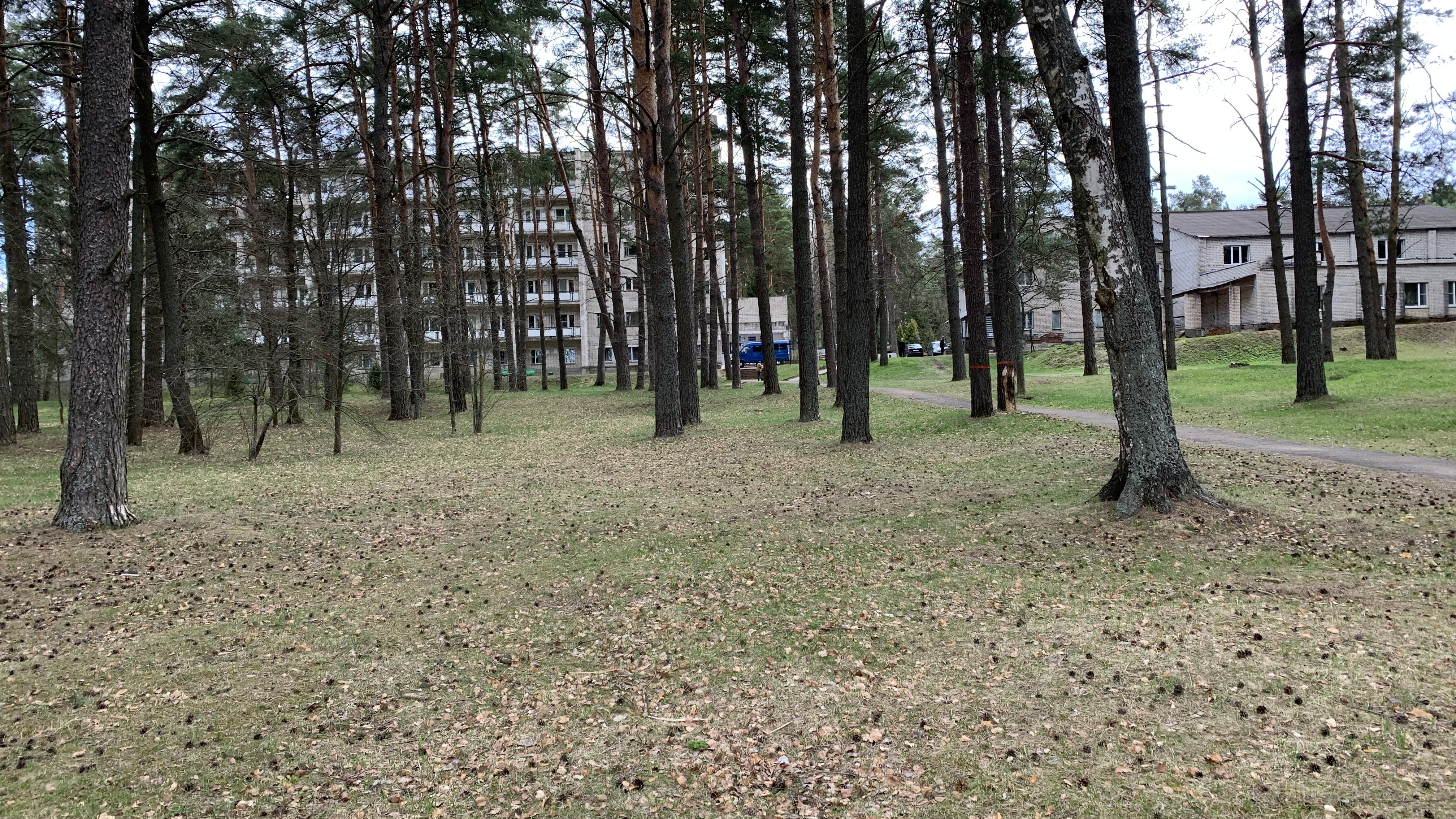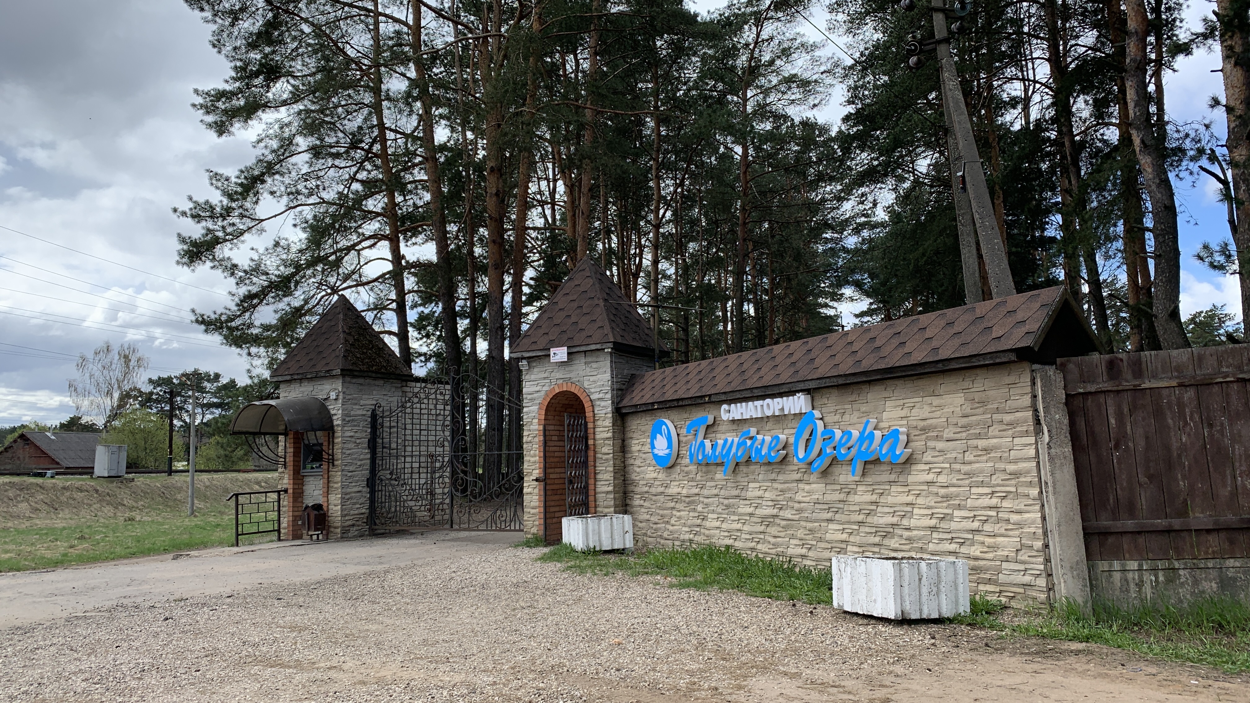 Зайти в "Голубые озера" можно через главные ворота. На территории футбольное поле, спортивная площадка, кустарники и сосны. В глубине санатория сад, через который попадаешь к административным зданиям и столовой. Далее корпус, где живут беженцы. Сразу за порогом сосновый бор с видом на озеро. Здесь по тропинкам прогуливается женщина с небольшой собачкой. Администрация санатория разрешила заселяться и с домашними питомцами.