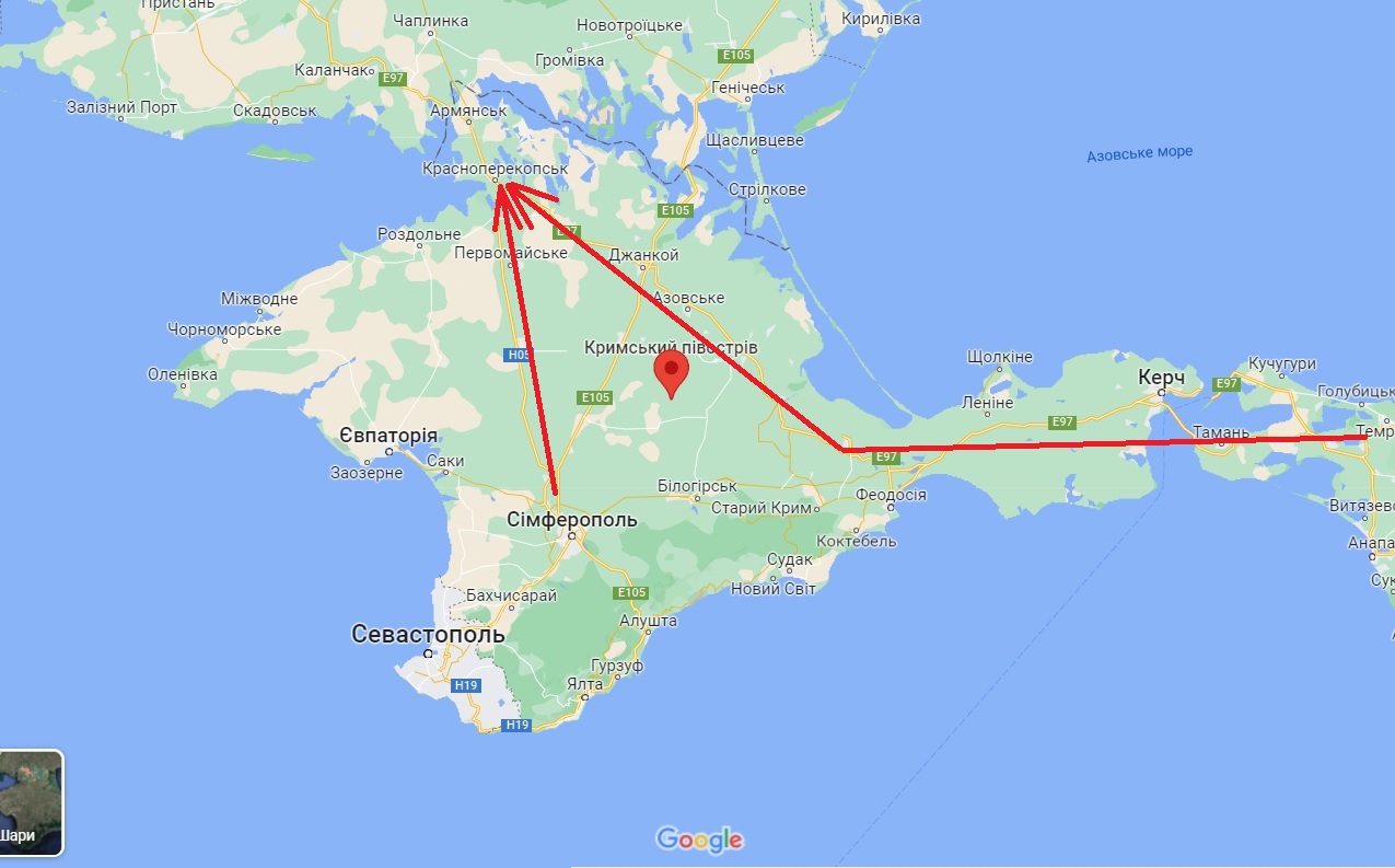 Как пролегают крымские автотрассы до Красноперекопска и Армянска от моста через Керченский пролив и из Симферополя мы обозначили на карте (на ней нет трассы «Таврида», которая почти достроена российскими властями в Крыму).