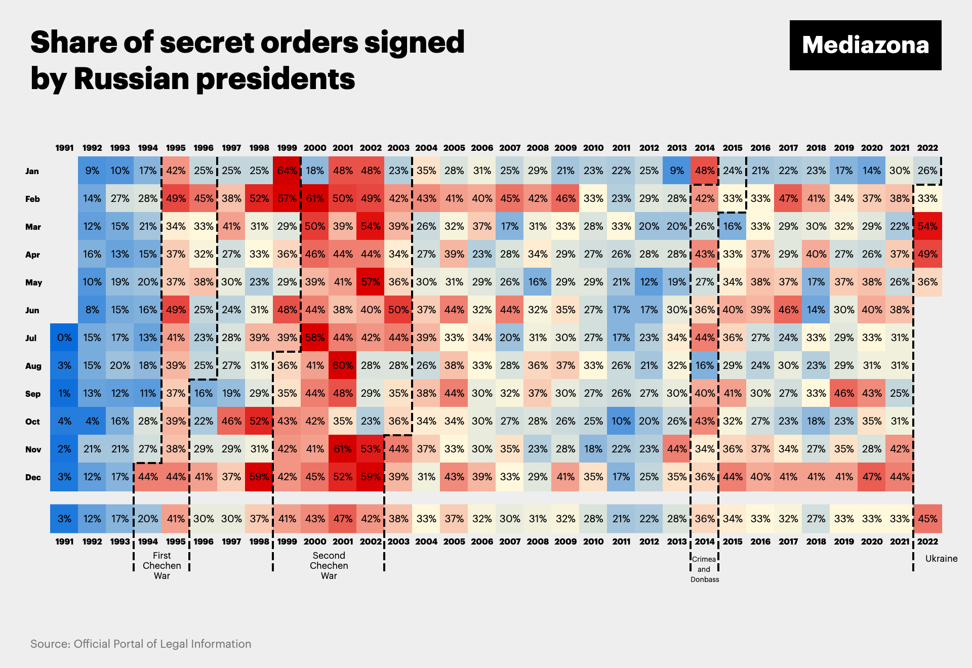 The Constitution of the Russian Federation gives the president a very wide range of powers, among them the power to issue ukazy, executive orders with the status of a by-law. Unlike laws, these can be classified, and can take effect immediately. These acts concern two topics of particular relevance during the war: personnel reshuffles in the security forces and military decorations. Mediazona reviewed changes in proportion of secret orders over the last 20 years and found that during the "special military operation" in Ukraine the number has reached a record high.