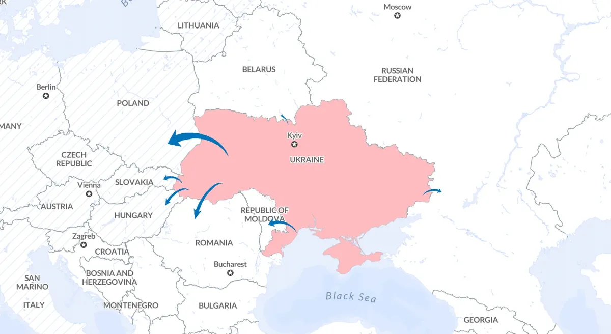 Большинство жителей Украины уехали в Польшу (3,3 млн человек), Румынию (900 тысяч), Россию (780 тысяч), Венгрию (580 тысяч), Молдову (450 тысяч) и Словакию (400 тысяч).