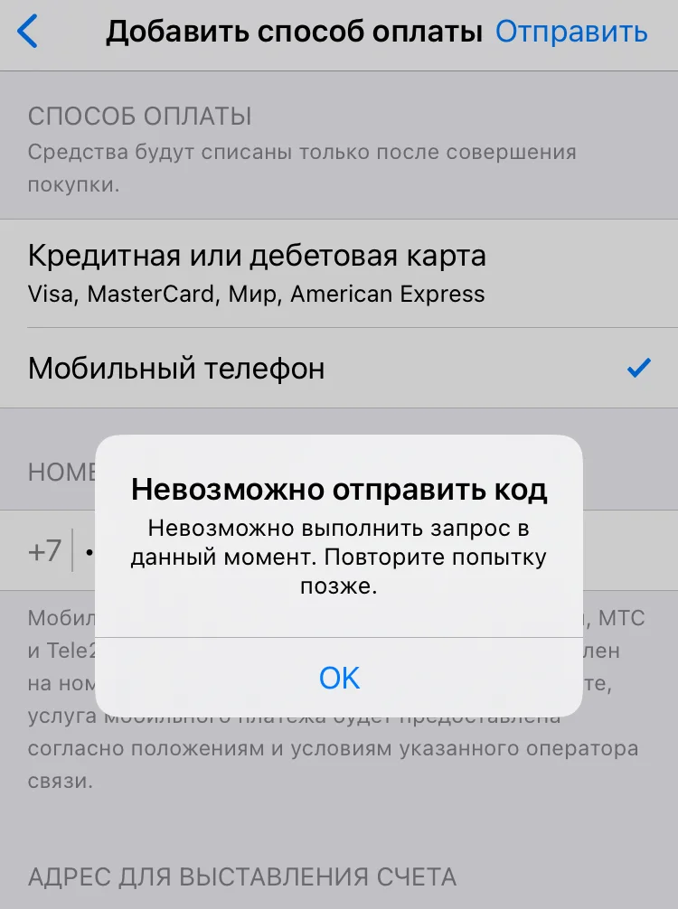 При попытке ввести для оплаты номер телефона, принадлежащий «Мегафону», происходит сбой операции. При этом на официальном сайте Apple до сих пор указано, что произвести оплату можно с «Билайна», «Мегафона», МТС и Yota.