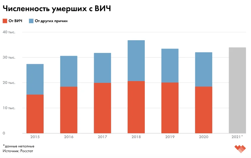 Исследователи отметили, что в 2021 году в России умерли 34 093 человека с ВИЧ. В среднем же ежегодно умирает около 30 тысяч людей с ВИЧ, из них около 60% — от причин, связанных с инфекцией. Одним из факторов, повлиявших на рост числа умерших с ВИЧ, стала пандемия коронавируса.