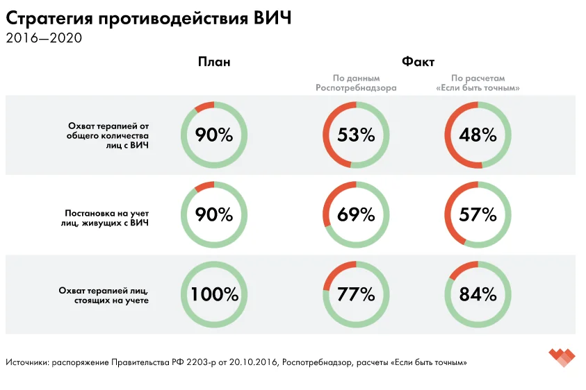 По данным Роспотребнадзора, в 2020 году 53,2% людей, живущих с ВИЧ, получали антиретровирусную терапию, в «Если быть точным» подсчитали, что этот показатель равен 47,8%. Исследователи сообщили, что цель была, чтобы 38,3% людей с ВИЧ были на терапии, если финансирование на закупки не увеличится. При росте финансирования планировалось, что количество ВИЧ-инфицированных на терапии достигнет 90%. Финансирование было увеличено. Одним из факторов, снизивших доступность терапии, также стала пандемия COVID-19. Сейчас есть трудности с ее получением из-за войны в Украине в связи с логистическими сложностями.