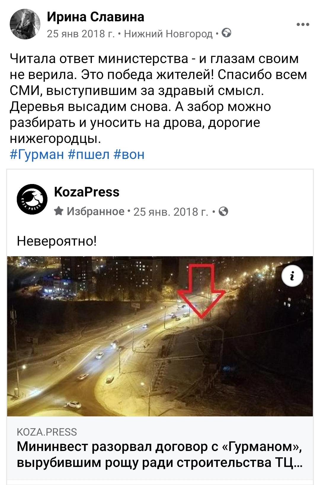 Одним из проектов Ирины Славиной, главного редактора независимого Нижегородского издания Koza.Press и общественного активиста, было спасение в 2015–2018 годах зеленой зоны около ее дома, на месте которой городские власти решили построить торговый центр. Застройщик вырубил десятки деревьев, но саму стройку усилиями общественников удалось остановить.