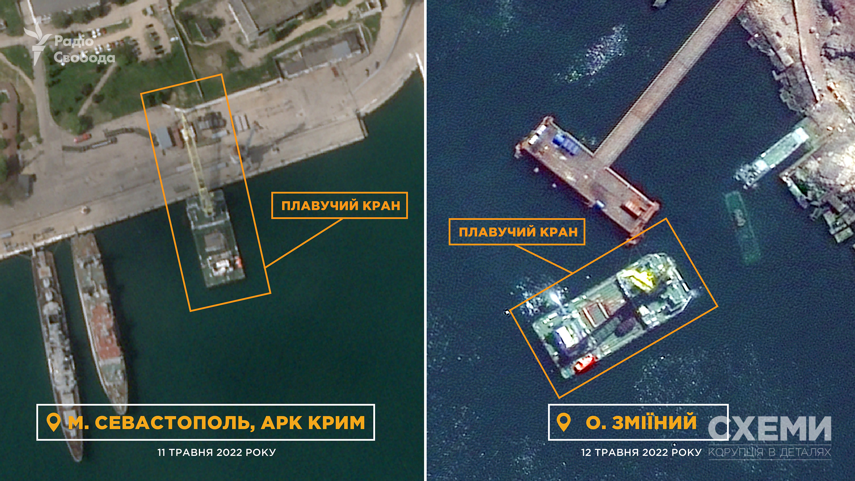 Ранее подобный плавучий кран был замечен в Севастополе, в бухте Голландия. Спутник Planet Labs зафиксировал его на аннексированном полуострове 11 мая.