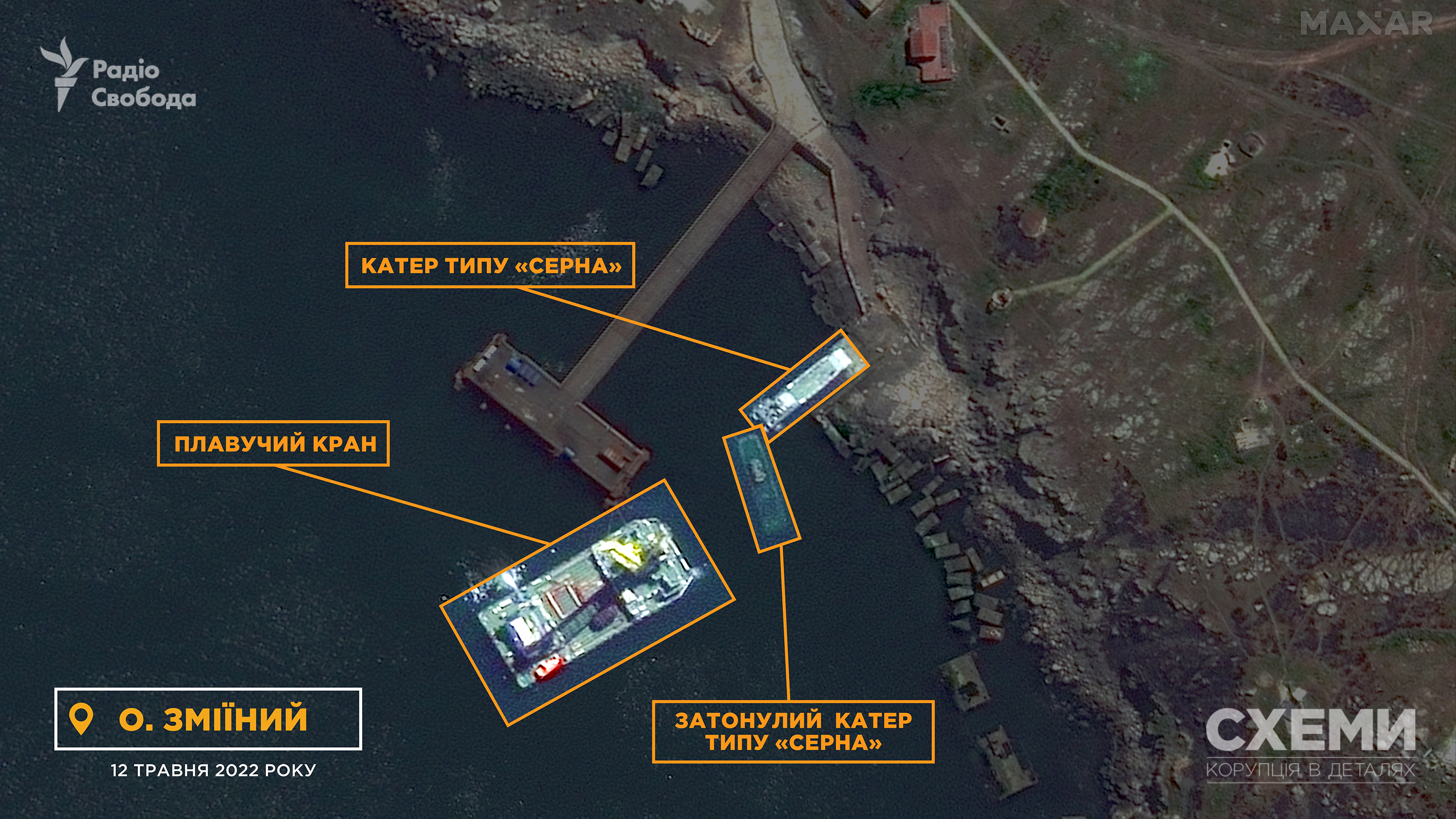 Также спутник 12 мая зафиксировал затопленный катер типа «Серна», возле которого – плавучий кран. Этот десантный катер украинский беспилотный летательный аппарат «Байрактар» уничтожил 7 мая.