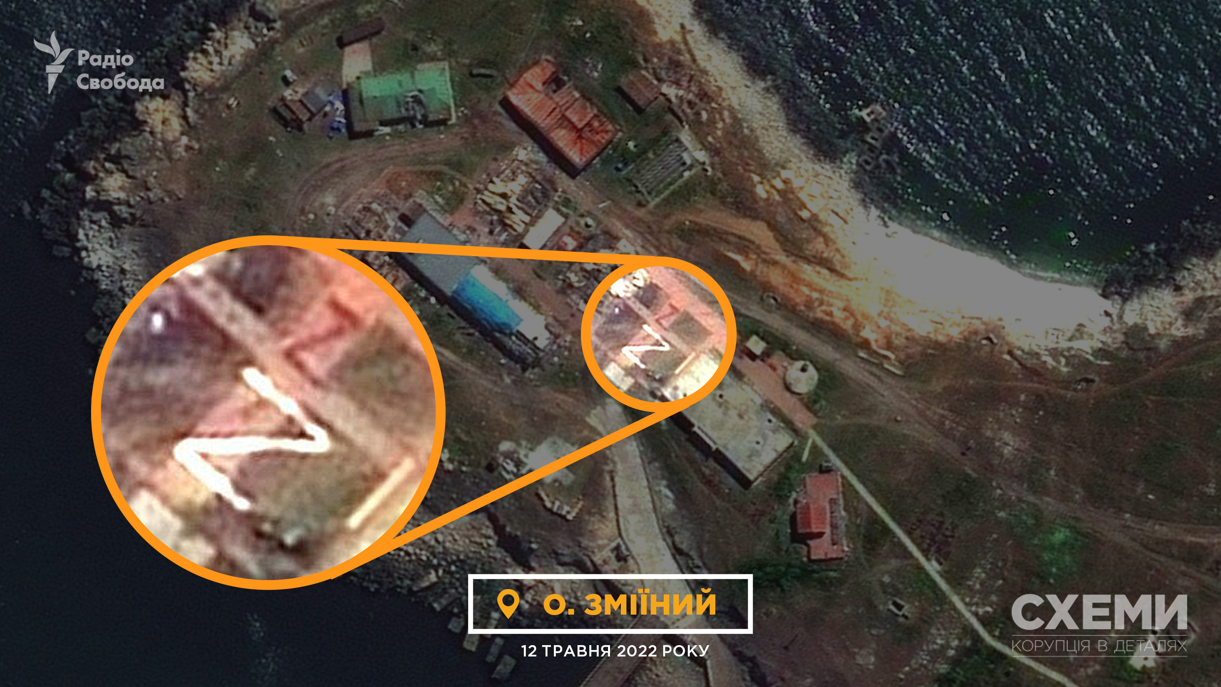 На спутниковых снимках Maxar за 12 мая на северо-восточной части острова видны большие буквы Z. Эта буква стала символом полномасштабного военного вторжения России в Украину и часто используется в российской пропаганде. Военная техника РФ тоже часто обозначена такой меткой.
