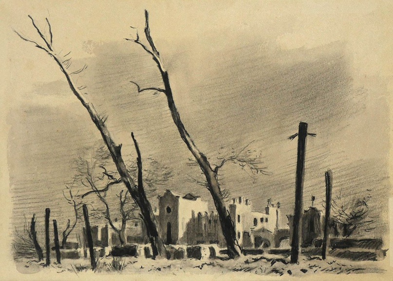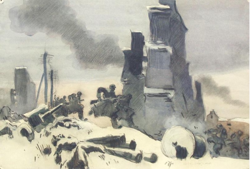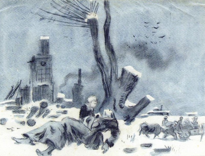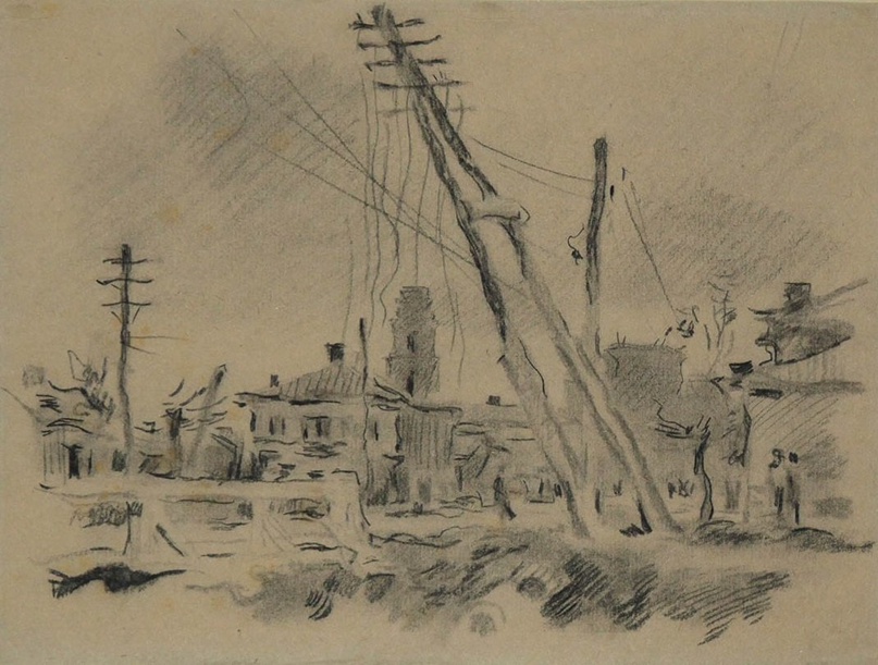 Лишь за пару лет до смерти Сигорский снова обратился к своим военным воспоминаниям, создав в 1976–77 годах потрясающую по силе образов и колориту цветную графическую серию под лаконичным названием «Война». Легли ли в основу этих образов и пейзажей впечатления, полученные художником в 1943 году в Орле и Брянске, – неизвестно. Поэтому давайте просто посмотрим некоторые из этих работ. И представим себе, как это было.