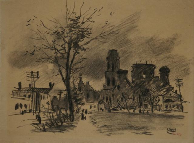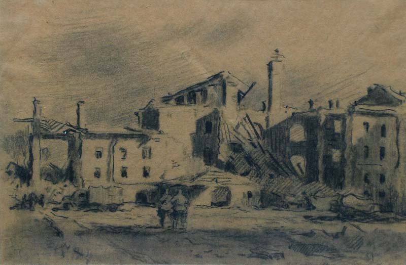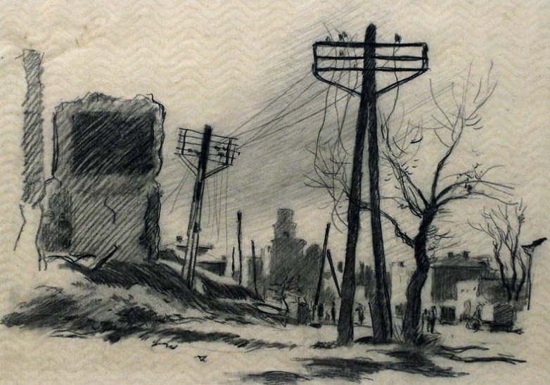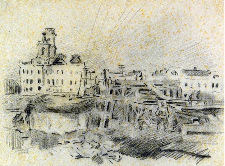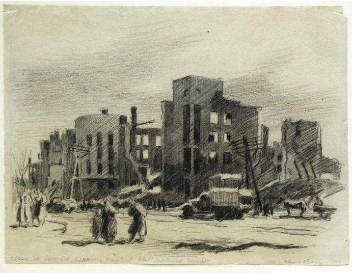 Сразу после осмотра вокзала и депо Сигорский направился по улице Московской в сторону центра Орла. По пути им было сделано несколько зарисовок. Не всегда их место удается определить. Ведь основное внимание художник уделял именно разрушенным зданиям, стремясь показать весь ужас войны и масштаб городских потерь. Большинство из увиденных им тогда руин вскоре после его визита были разобраны.