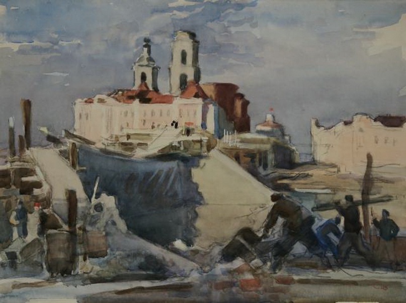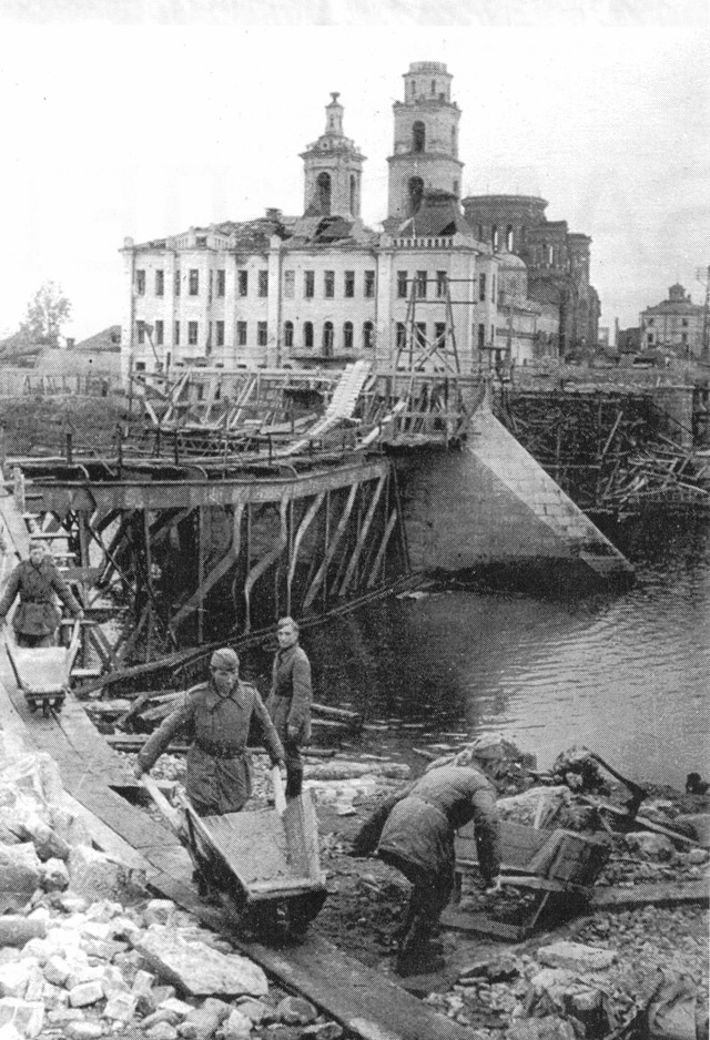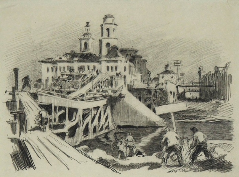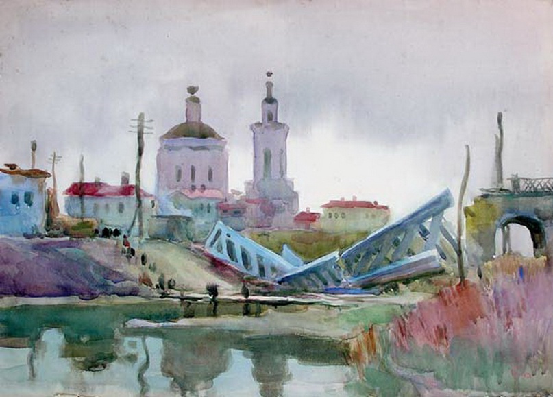 И акварель с разрушенным немцами Красным мостом и его восстановлением.