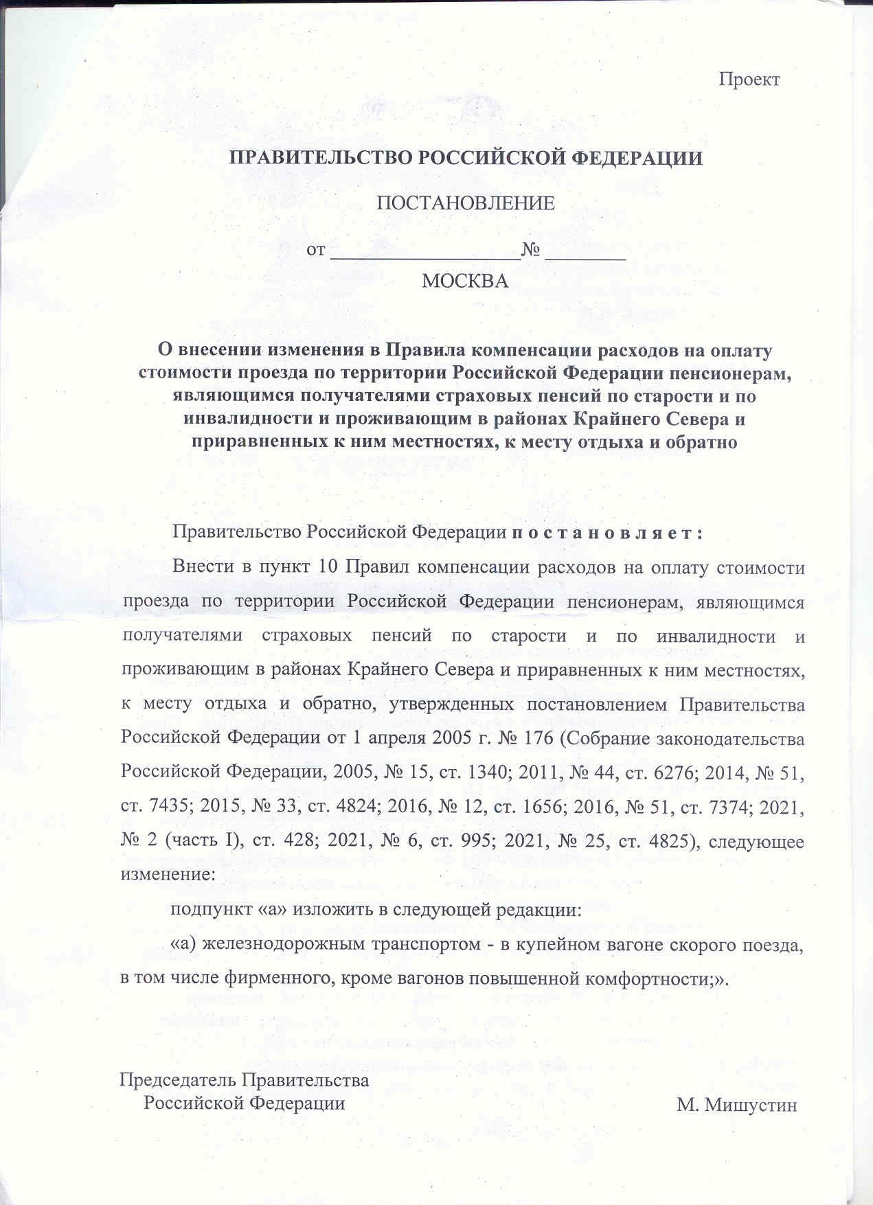 Проектом предлагается внести изменения в пункт 10 Правил компенсации расходов на оплату стоимости проезда по территории Российской Федерации пенсионерам, являющимся получателями страховых пенсий по старости и по инвалидности и проживающим в районах Крайнего Севера и приравненных к ним местностях, к месту отдыха и обратно, утвержденных постановлением Правительства Российской Федерации от 1 апреля 2005 г. №176, в части осуществления компенсации пенсионерам, являющимся получателями страховых пенсий по старости и по инвалидности и проживающим в районах Крайнего Севера и приравненных к ним местностях, стоимости проезда железнодорожным транспортом в размере, не превышающем стоимость проезда в купейном вагоне скорого поезда, в том числе фирменного, кроме вагонов повышенной комфортности.