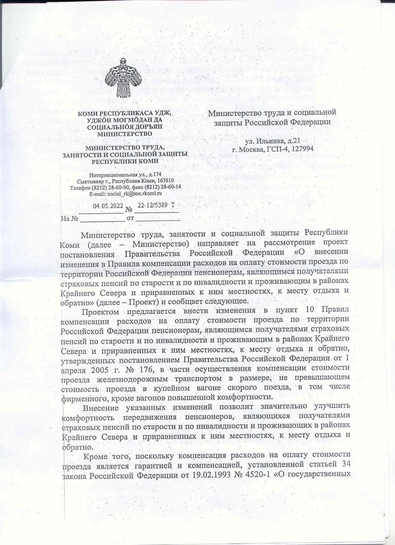 Ваше обращение по вопросу внесения изменений в Правила компенсации расходов на оплату стоимости проезда по территории Российской Федерации пенсионерам, являющимся получателями страховых пенсий по старости и по инвалидности и проживающим в районах Крайнего Севера и приравненных к ним местностях, к месту отдыха и обратно, направленное в адрес заместителя Председателя Правительства Республики Коми - министра экономического развития и промышленности Республики Коми Э. А. Ахмеевой, рассмотрено Министерством труда, занятости и социальной защиты Республики Коми (далее - Министерство) в соответствии со статьей 10 Федерального закона от 2 мая 2006 года № 59-ФЗ «О порядке рассмотрения обращений граждан Российской Федерации».