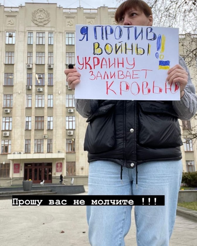 В начале марта Марина Захарченко провела в Краснодаре одиночный пикет с плакатом «Я против войны!! Украину заливает кровью».