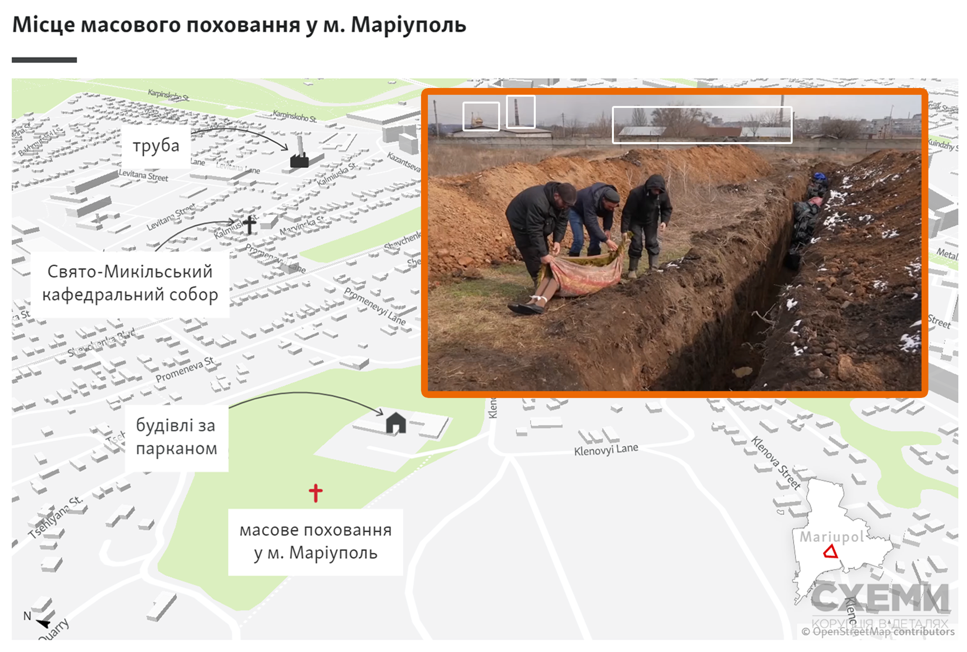 10 марта журналистка азербайджанского издания APA TV Илаге Велиева выкладывала на своей странице Facebook видео с массовыми захоронениями погибших мариупольцев, однако не указала точное место захоронения. Анализируя видео, «Схемы» смогли подтвердить, что речь идет именно об историческом кладбище «Некрополь» в центре Мариуполя.