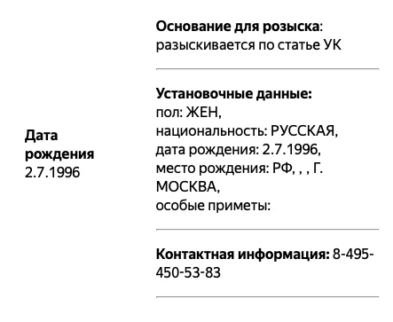 В базе говорится, что Штейн разыскивается по статье УК. На прошлой неделе источники РБК сообщили о проверке СК в отношении Штейн. Поводом для этого послужили твиты, в которых, как считают в СК, была «ложная информация» о преступлениях российских военных в Украине.