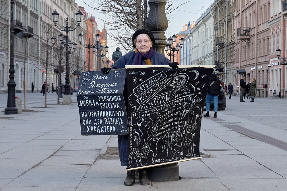 Петербургской художнице Елене Осиповой 76 лет. Последние 20 из них она выходит на протестные акции с плакатами — каждый она рисует сама. За то, что Осипова не боится открыто высказываться о происходящем в России и мире, в апреле ей присвоили почетное гражданство Милана.